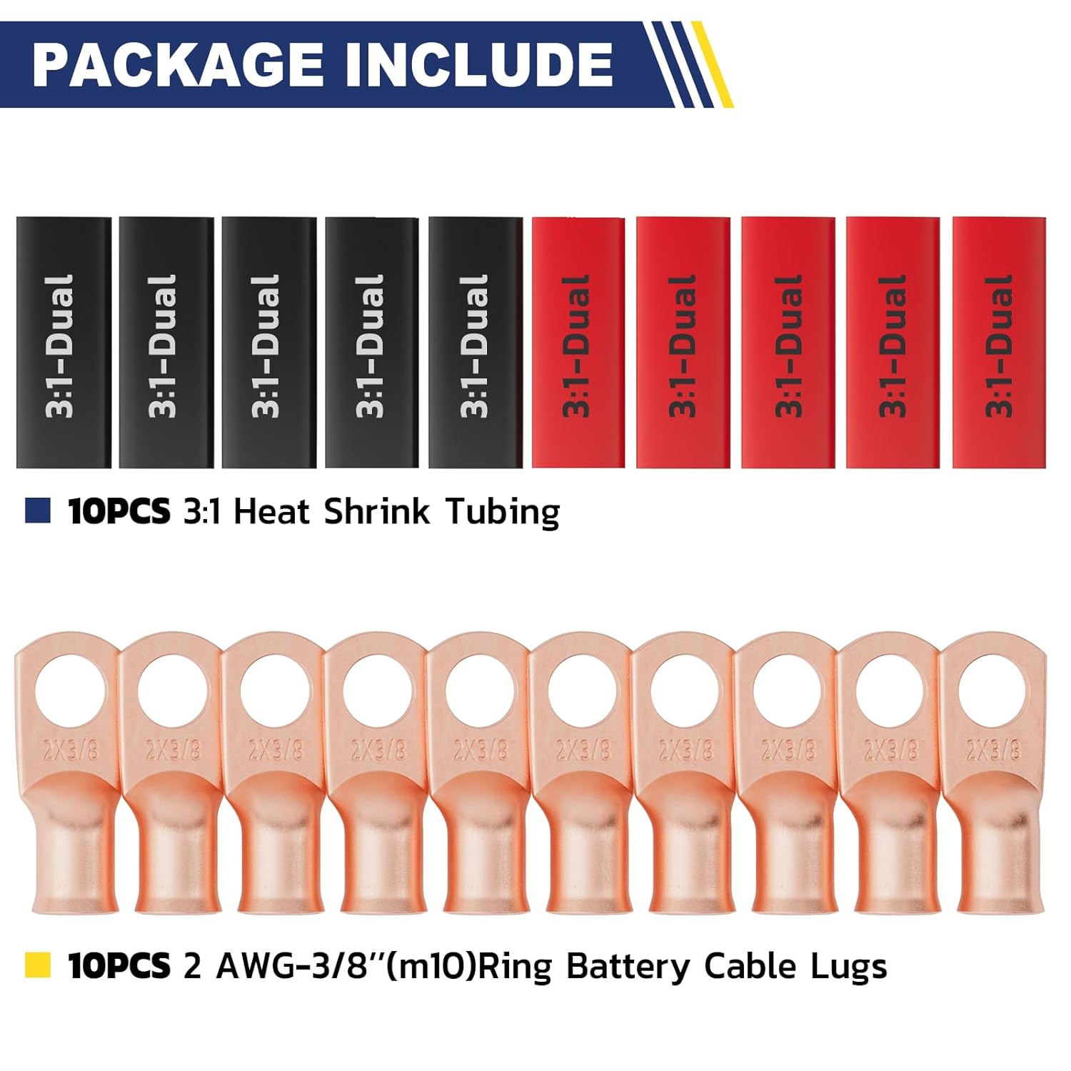 - Copper Lugs and Heat Shrink Tubing Kit: 10 PCS 2 gauge (AWG) - 3/8" (M6)ring terminals copper wire lugs and 10 PCS 3:1 Dual Wall Adhesive Heat Shrink Tubing(5 black and 5 red), and comes with a sturdy clear plastic jar that make battery cable ends easy storage