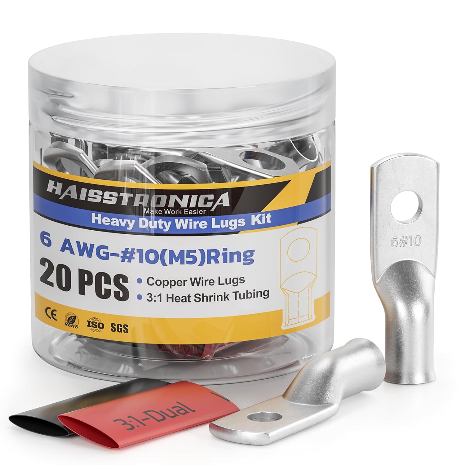 - Tinned Copper Lugs and Heat Shrink Tubing Kit: 10 PCS 6 gauge (AWG) - #10 ring terminals tinned copper wire lugs and 10 PCS 3:1 Dual Wall Adhesive Heat Shrink Tubing(5 black and 5 red), and comes with a sturdy clear plastic jar that make battery cable ends easy storage