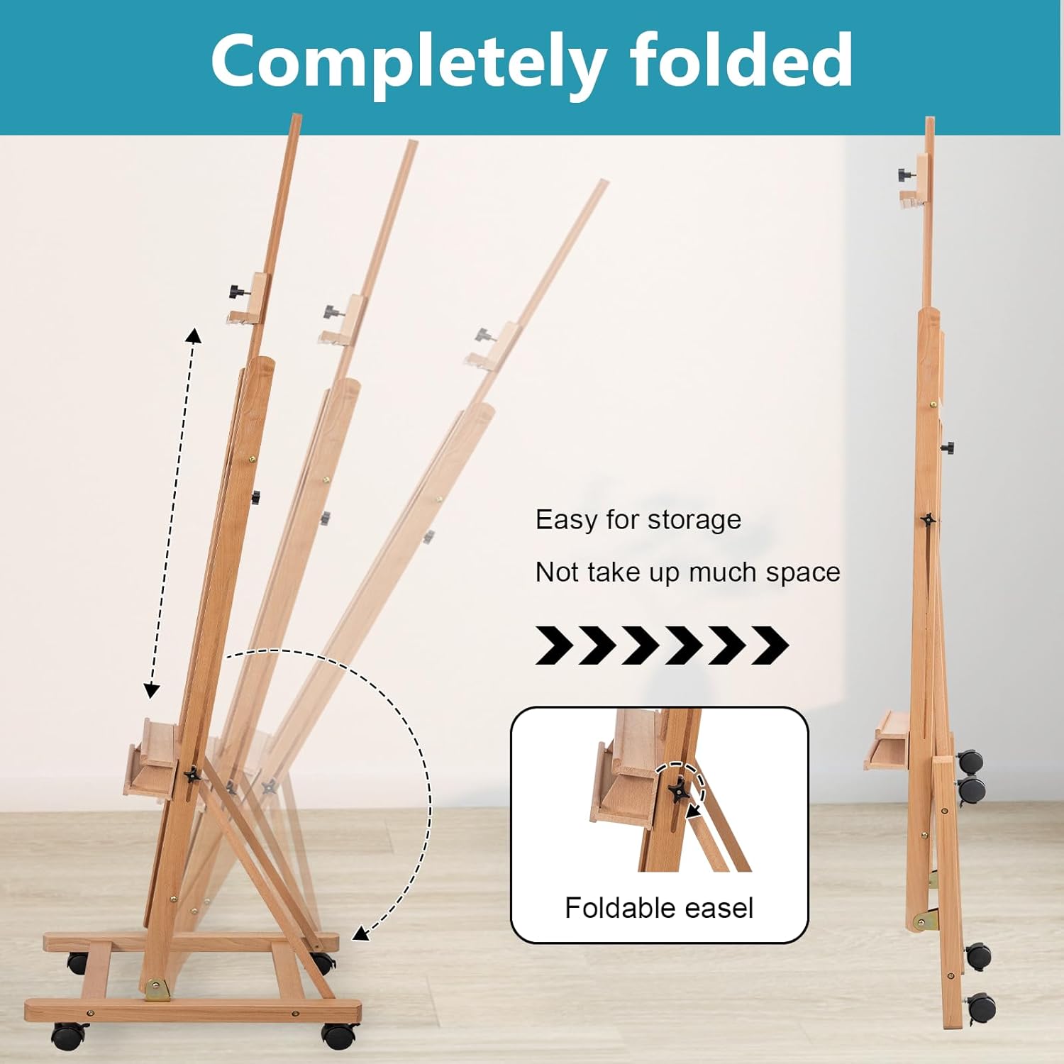 H-Frame Studio Easel, Beechwood Artist Easel with Wheels and Storage Tray, Adjustable Floor Easel Stand Holding Canvas up to 51Inches for Painting, Natural