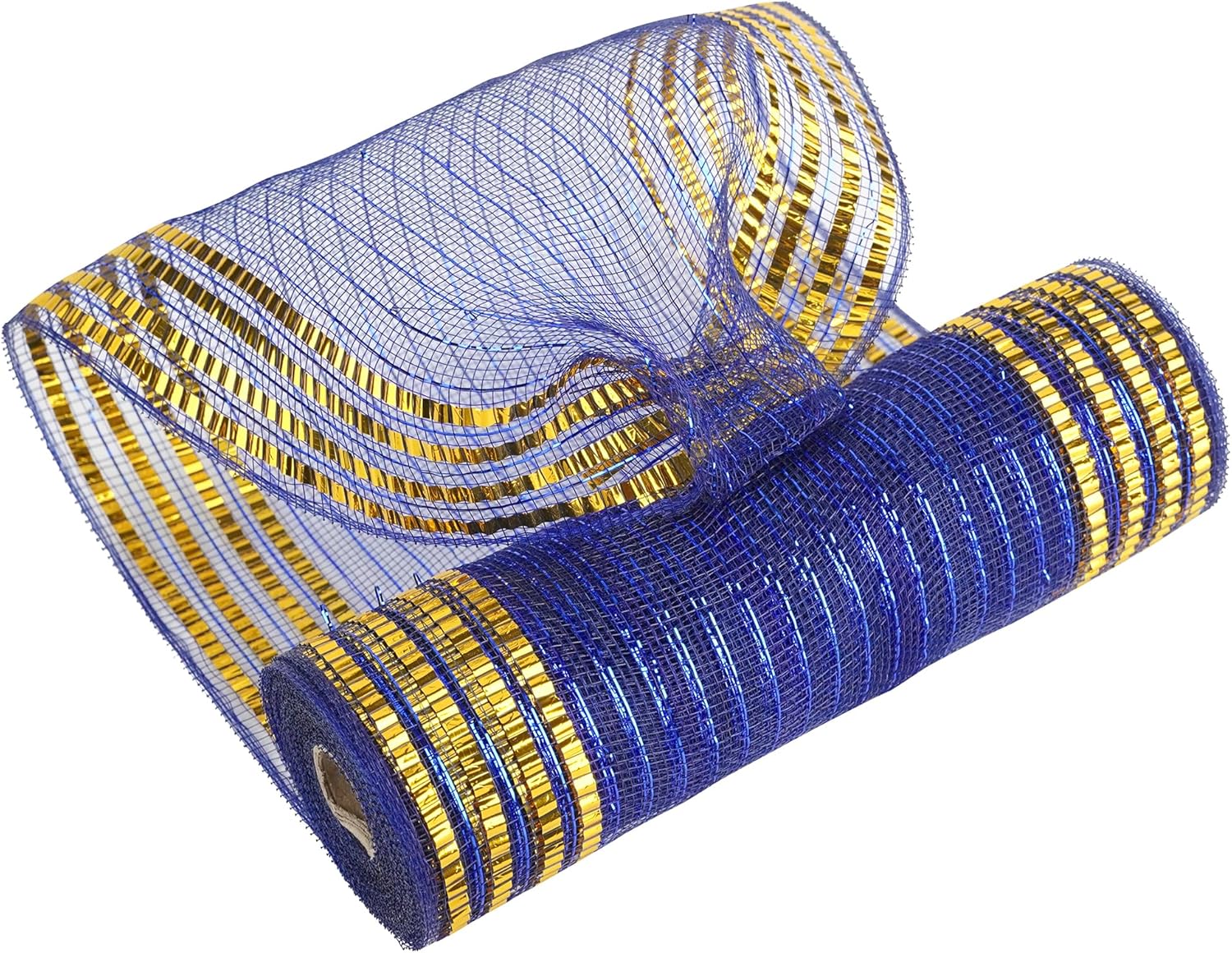 - A 10 inch wide, 10 yards roll of navy blue poly mesh has blue metallic stripes in its center and between its extra-wide gold metallic stripes. Each of the extra-wide foil strips has a corrugated look created by the weaving method. Whether you're making a wreath, a garland, or a bow, the beautifully full ruffles, curls and poofs that you fix into your design will stay that way.