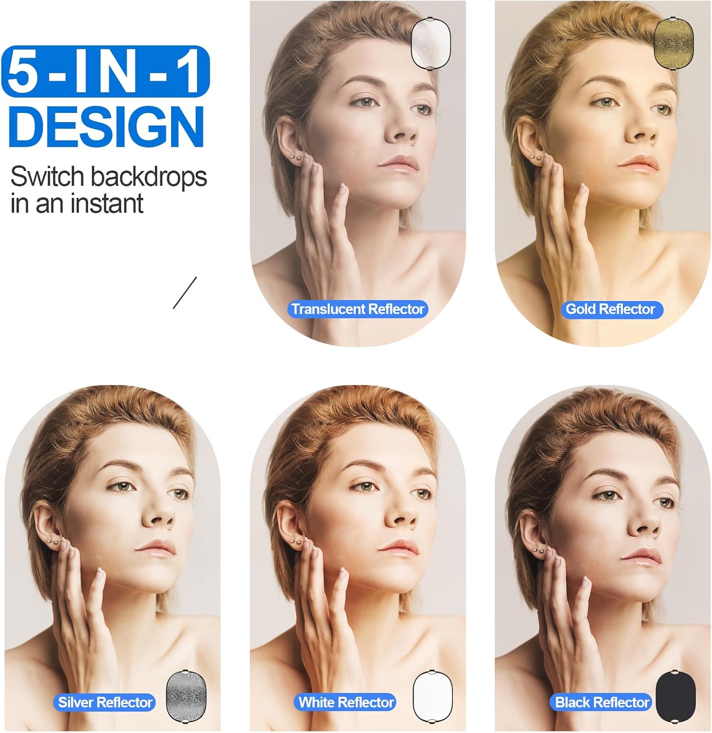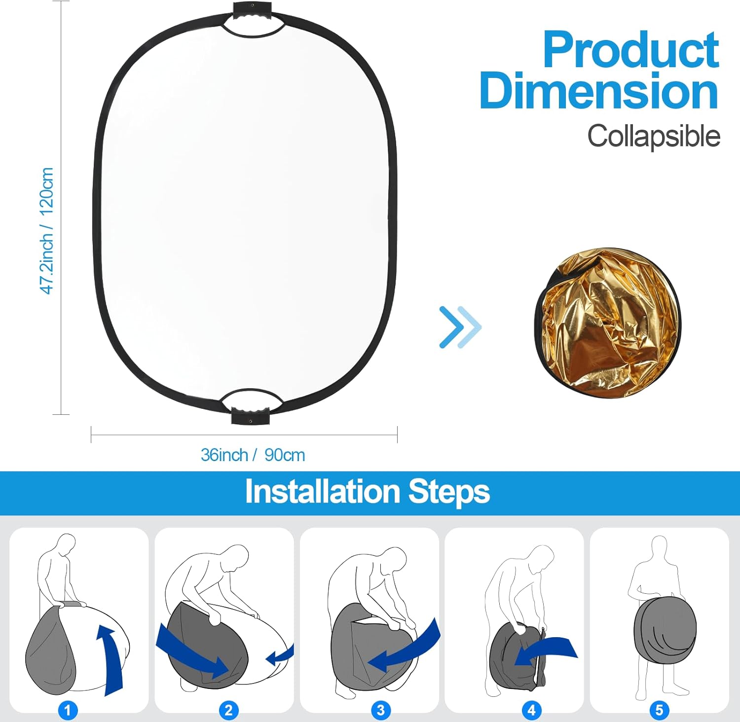 - 【5-In-1】 A 35''x47'' (90x120cm) interchangeable reflector (silver/gold/white/black/translucent) lets you bounce light with ease: silver to reflect light without distorting color; gold to warm up, recommended for outdoor shooting; white to soften light and preserve natural color; black to absorb light and creates dark effects; translucent to diffuse light and eliminate shadows.