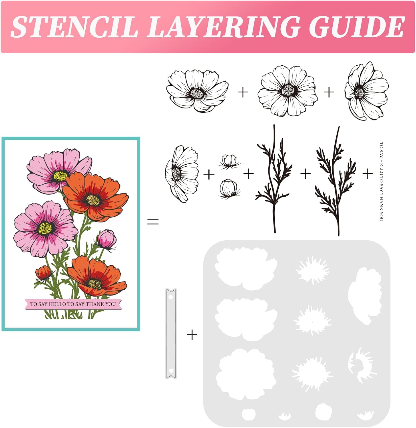 ORIGACH Realistic Cosmos Flower Layering Stencils Set for Card Making, Coreopsis Flower Stencil Template Silicone Stamps and Die Sets for Scrapbooking DIY Crafting
