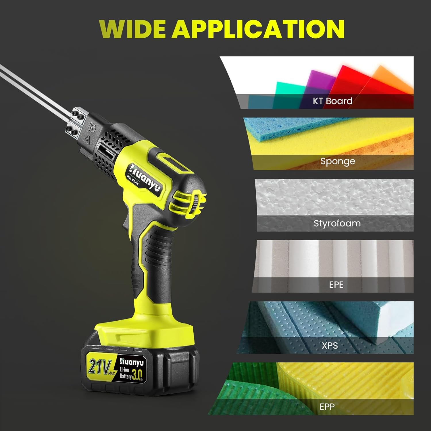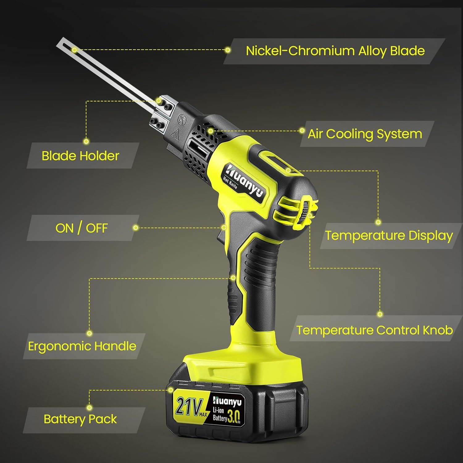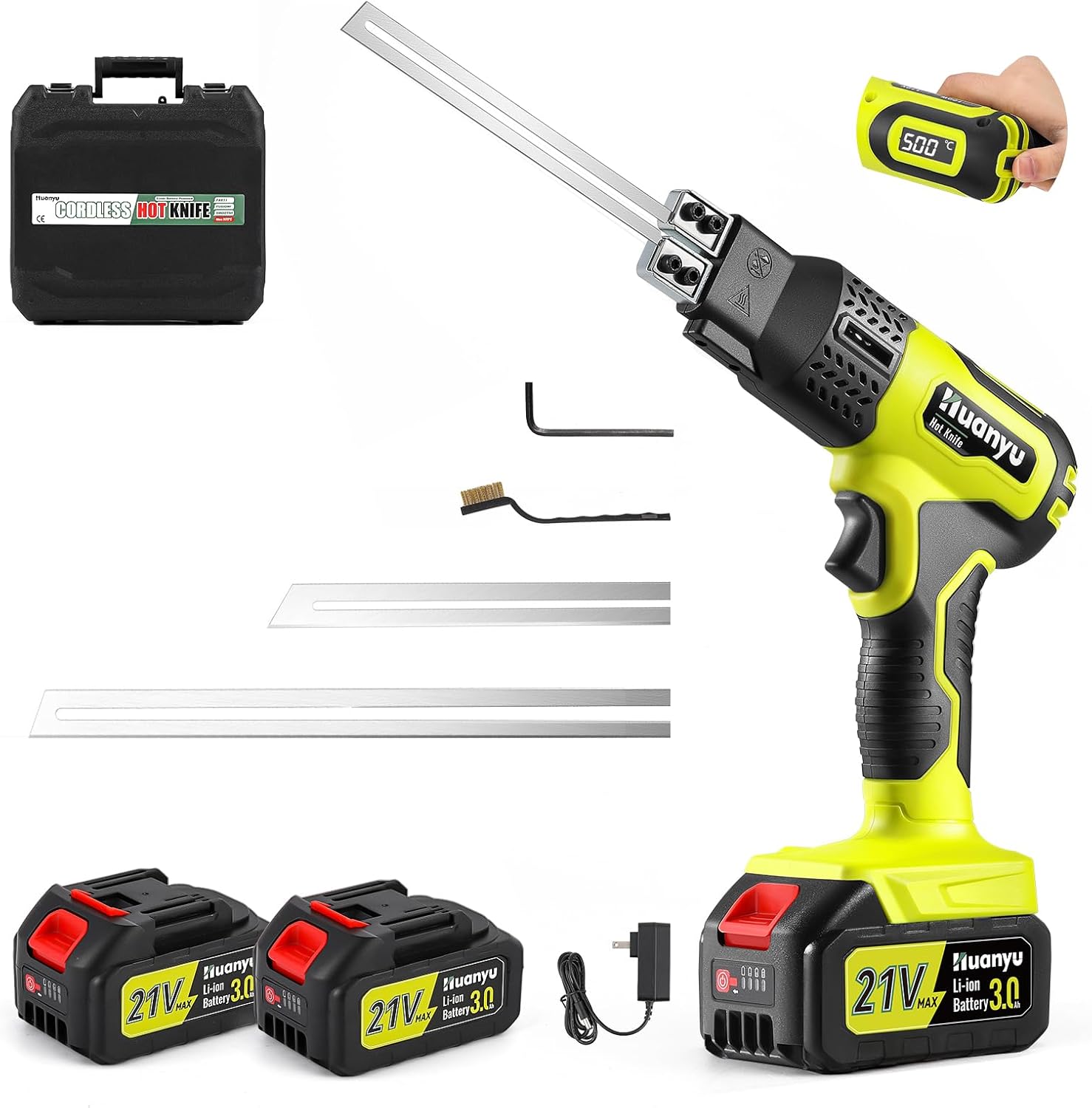 Huanyu Cordless Hot Knife with Temperature Display 100W Max 500℃ 3.0Ah Battery Powered Air Cooling Cutting Tool 2 Blades 4"+6" Set Electric Hot Knife for Styrofoam, Rope, Fabric, Acrylic