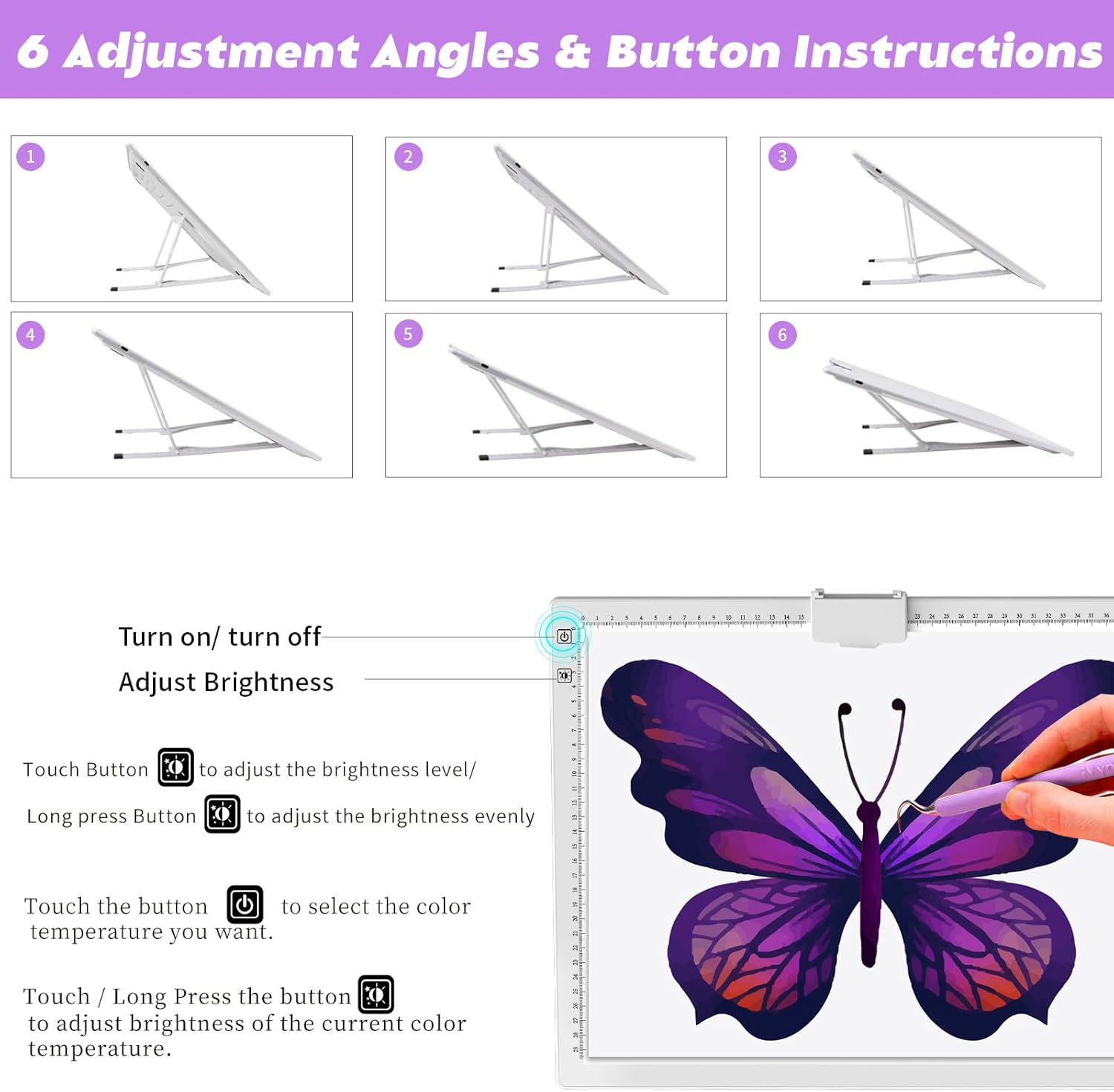 - ►Rechargeable Light Pad--Diamond art light pad with the built-in 2500mAh battery, this tracing light box can be used for 5 hours wirelessly after 2 hours charging.Artists light boxes come with a one-piece stand, 3 light colors 6 levels of brightness and stepless dimming for free brightness adjustment.