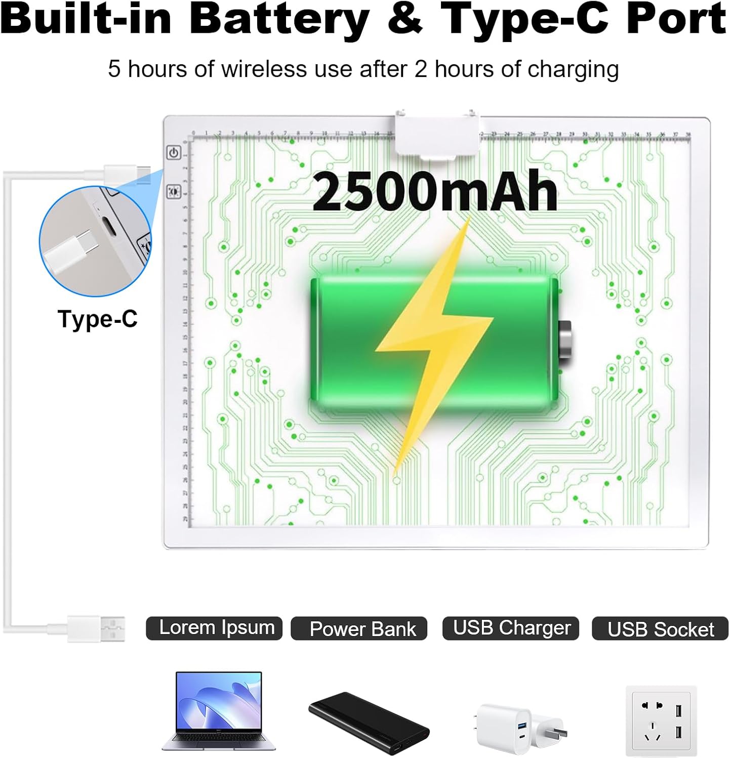 - β[2500mAh Rechargeable Battery]--The A3 rechargeable light pad contains a 2500mAh lithium battery, which can work for 5 hours after 2 hours charging. Applicable to cordless use and charging while using.