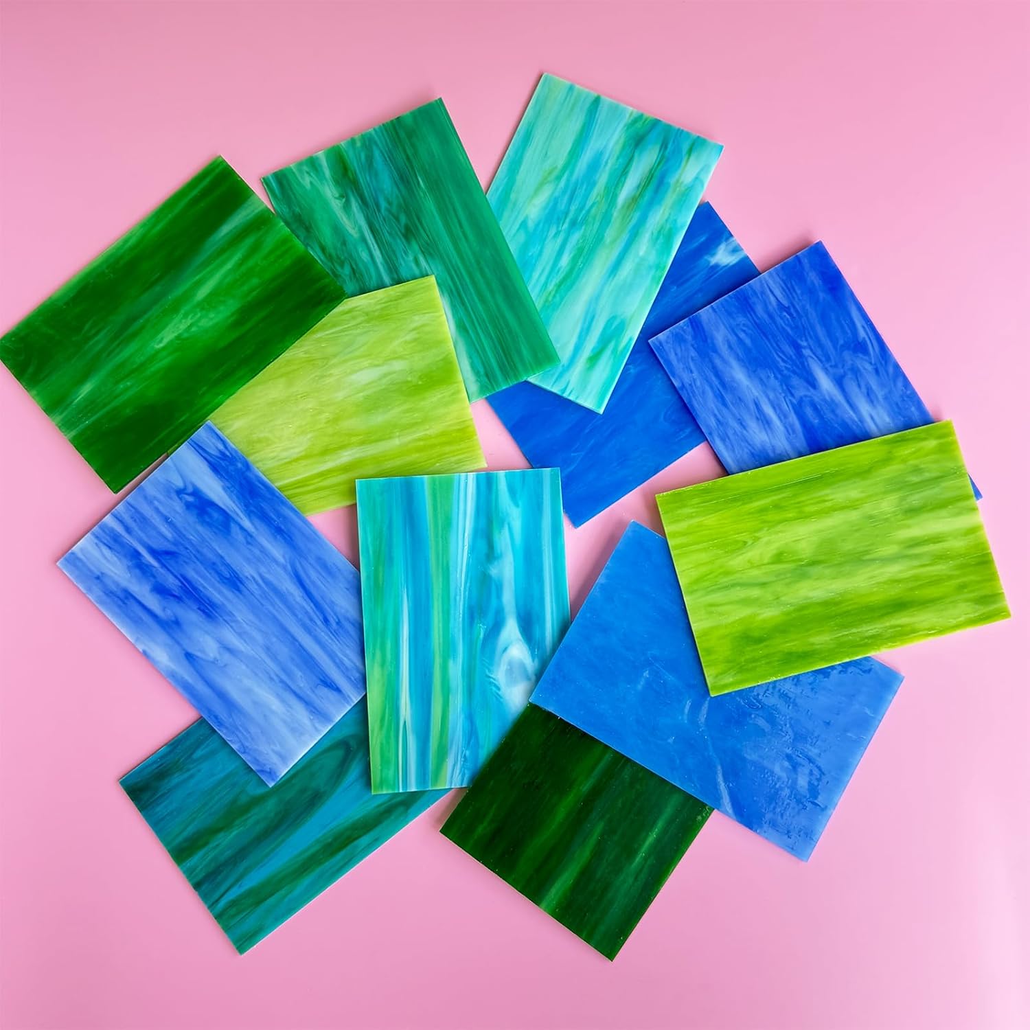 - 12 sheets stained glass sheets, assorted blue and green colors