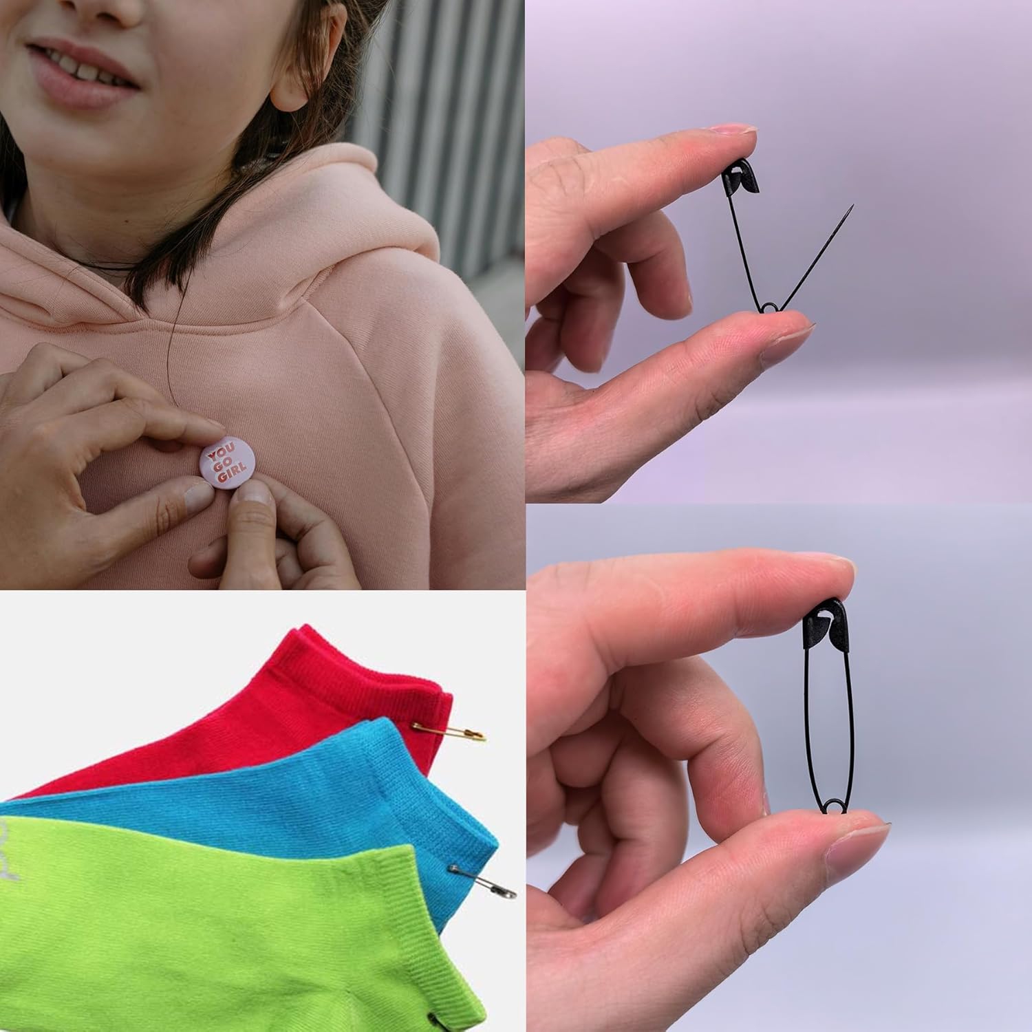 - π [Multi-Use] These safety pins are perfect for Everyday Use, universally and commonly used to fasten pieces of paper, fabric or clothing together and do not cause damage or large hole.