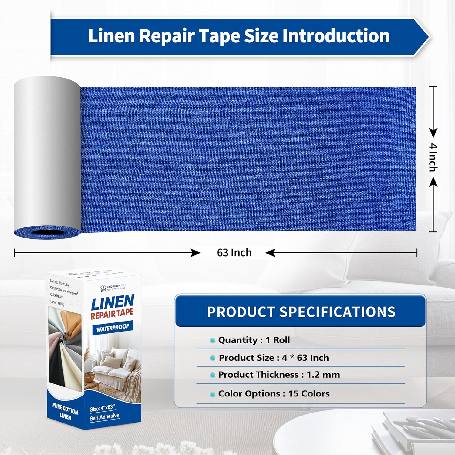 KING MOUNTAIN Linen Repair Patches, Self-Adhesive Linen Fabric Patches, 4 X 63 inch Extra Size, Multi Color, Can be Used for Linen Sofa Repair and Linen Clothes Repair (Navy Blue)