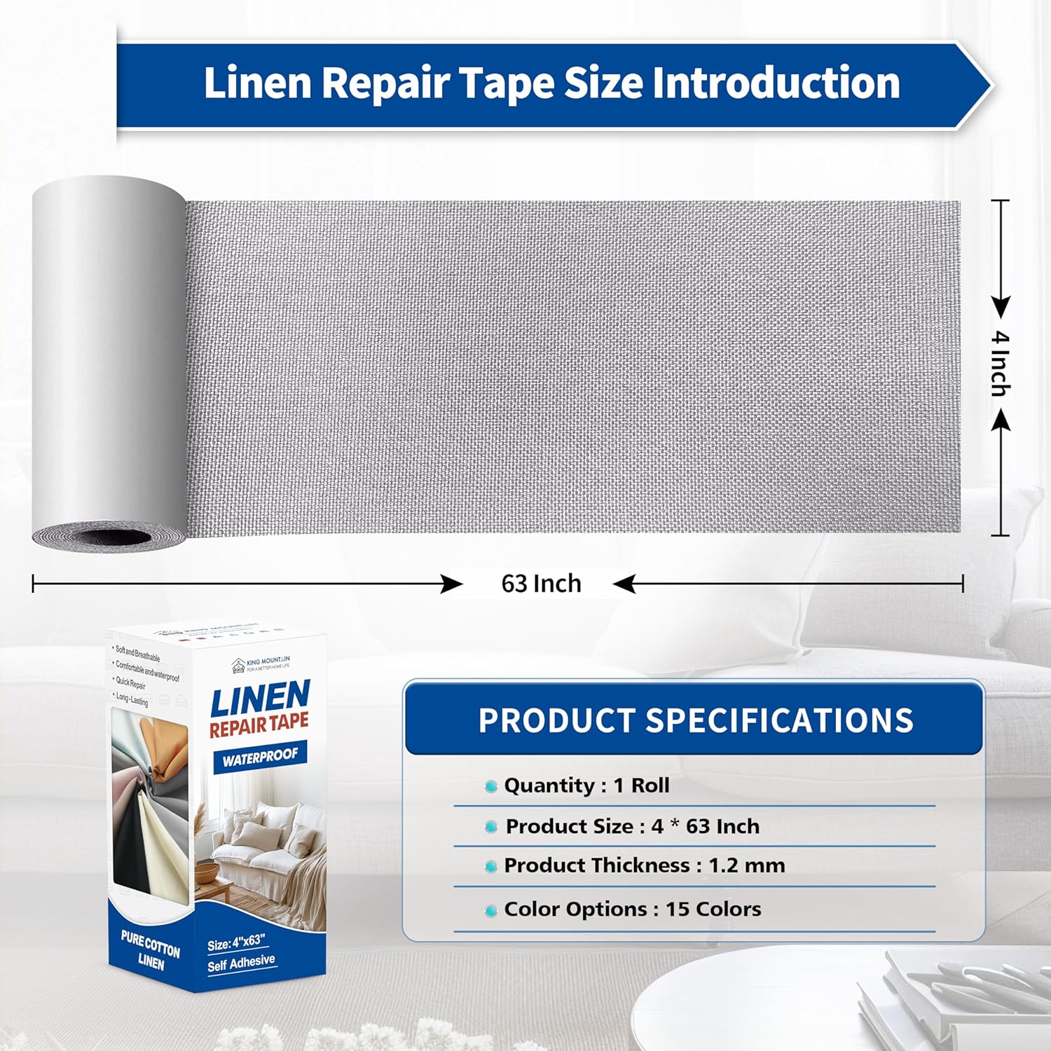 KING MOUNTAIN Linen Repair Patches, Self-Adhesive Linen Fabric Patches, 4 X 63 inch Extra Size, Multi Color, Can be Used for Linen Sofa Repair and Linen Clothes Repair (Light Grey 3.0)