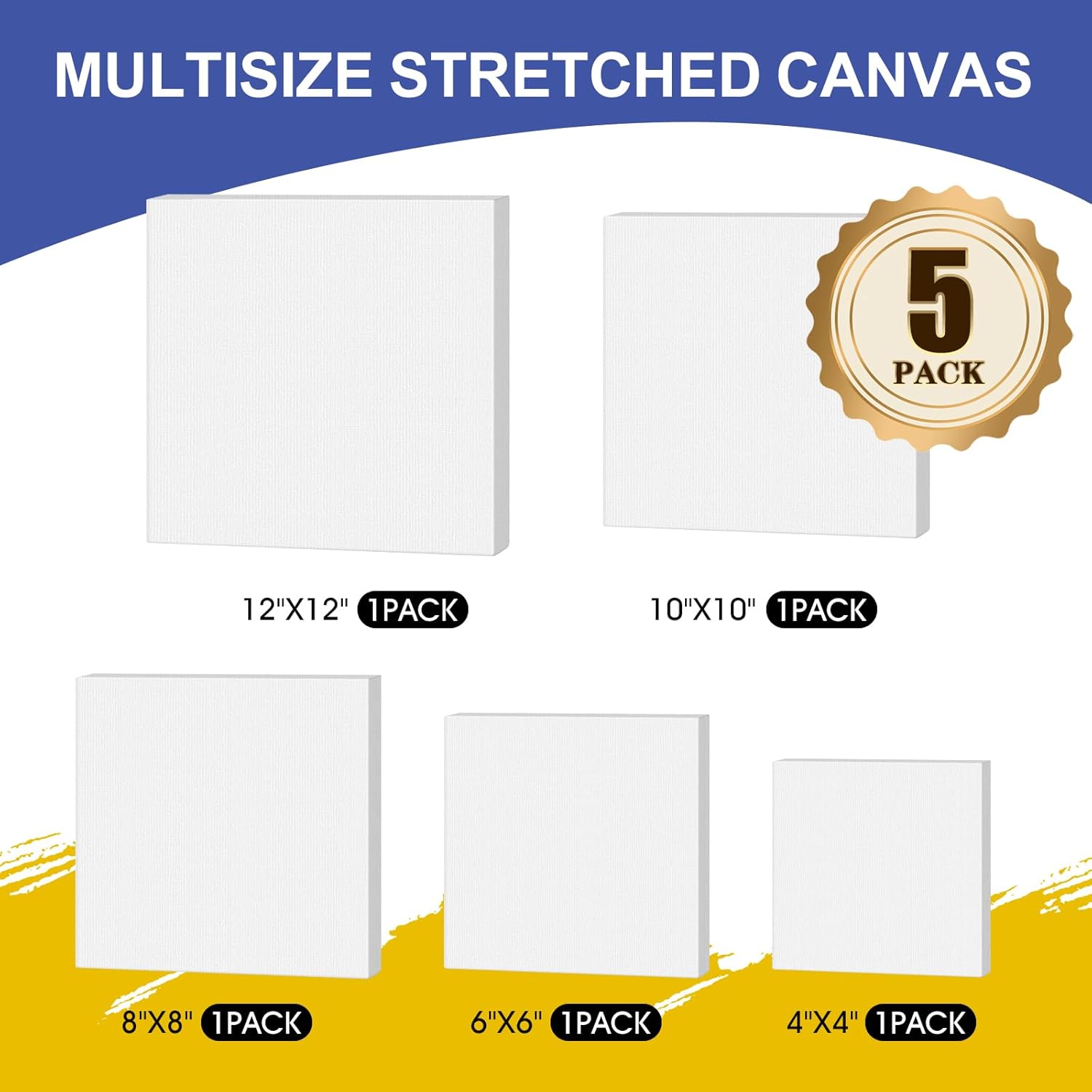 FUMILE Stretched Canvas for Painting Multi 5 Pack Square Canvas 4x4,6x6,8x8,10x10,12x12(1 of Each), Cotton Primed Acid Free Blank Canvases for Oil Paint, Acrylic Paint, Gouache and Tempera.