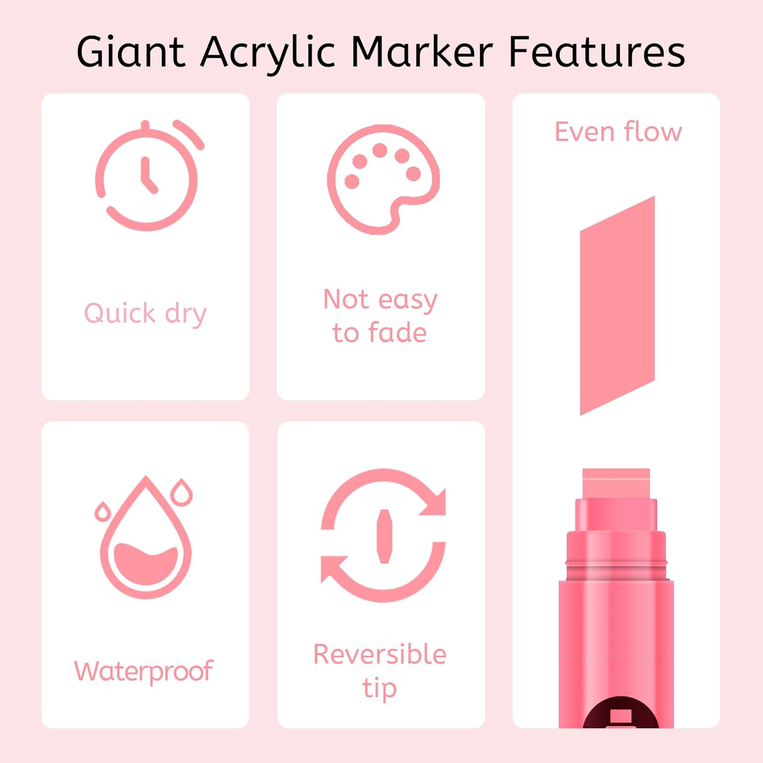 - Instruction: For the acrylic paint markers please shake the marker before use, and press the nib up and down or several times until jumbo marker tip fills with ink(first time use). Please cover the cap after use, in case the Ink dries out.