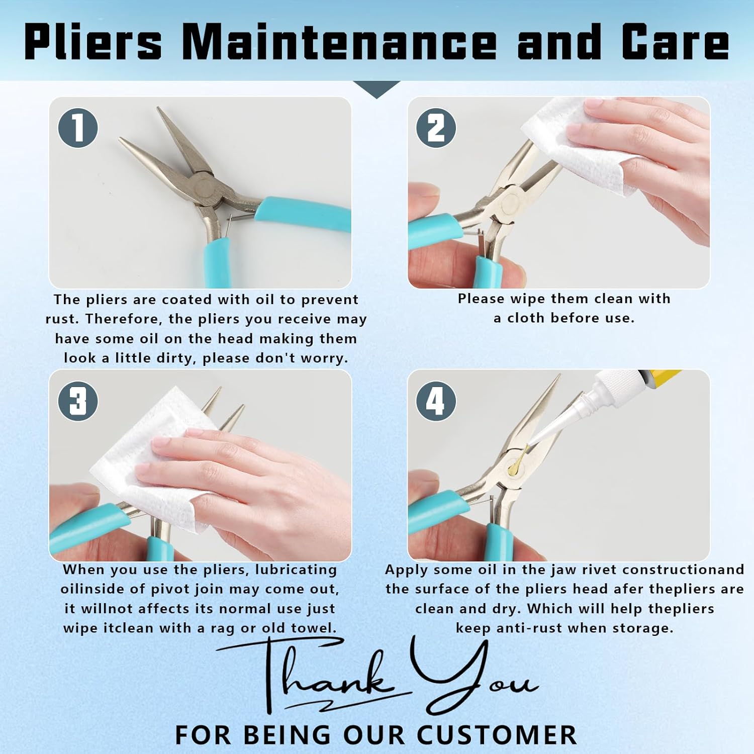 - Premium Material: The jewelry pliers for jewelry making are made of outstanding steel, rust resistant for long time use. The craft plier with a smooth and shiny surface is designed for jewelry making and repairing, without worrying about scratches or leaving marks on the jewelry. Note: The joints of the jewelry pliers are coated with black lubricating oil for more flexible use, not dirty. If you mind, you can wipe it with a paper towel.