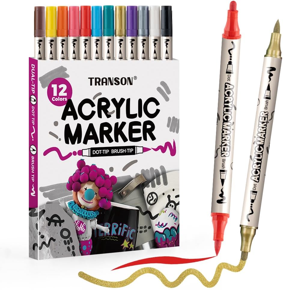 TRANSON 12 Colors Bold and Brush Dual-tip Acrylic Paint Marker Pen Set for Canvas Rock Wood Leather Ceramic DIY Painting