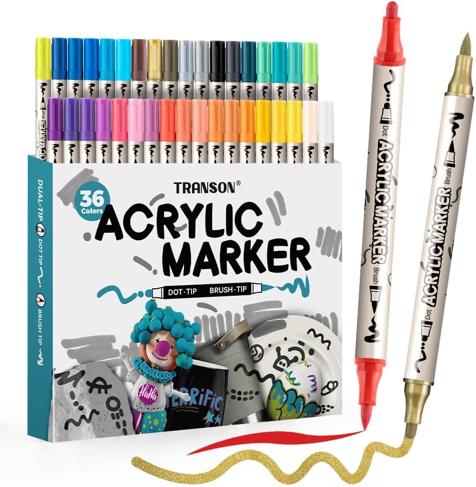 TRANSON 36 Colors Bold and Brush Dual-tip Acrylic Paint Marker Pen Set for Canvas Rock Wood Leather Ceramic DIY Painting