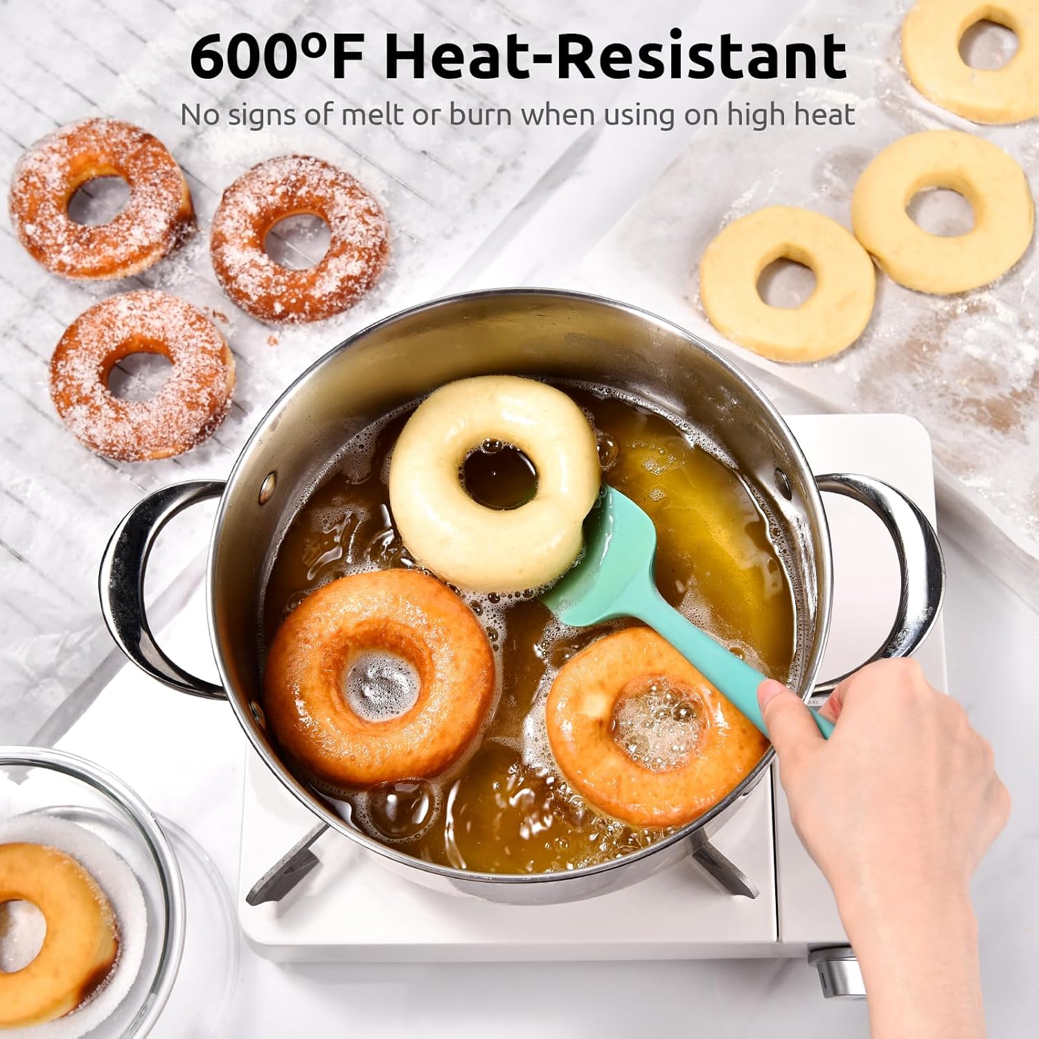 - [600ºF Heat-Resistant for High Heat Cooking] With up to 600 degrees heat resistance, you can use this nonstick silicone spatula in a hot pan without worrying about melted plastic in your dinner. It also works well with high temp sugars, chocolates or sauces. A must for newer cooks who might tend to leave utensils in a nonstick pot while cooking. You can use this heat safe silicone scraper daily for everything from stirring to frying to smoothing.