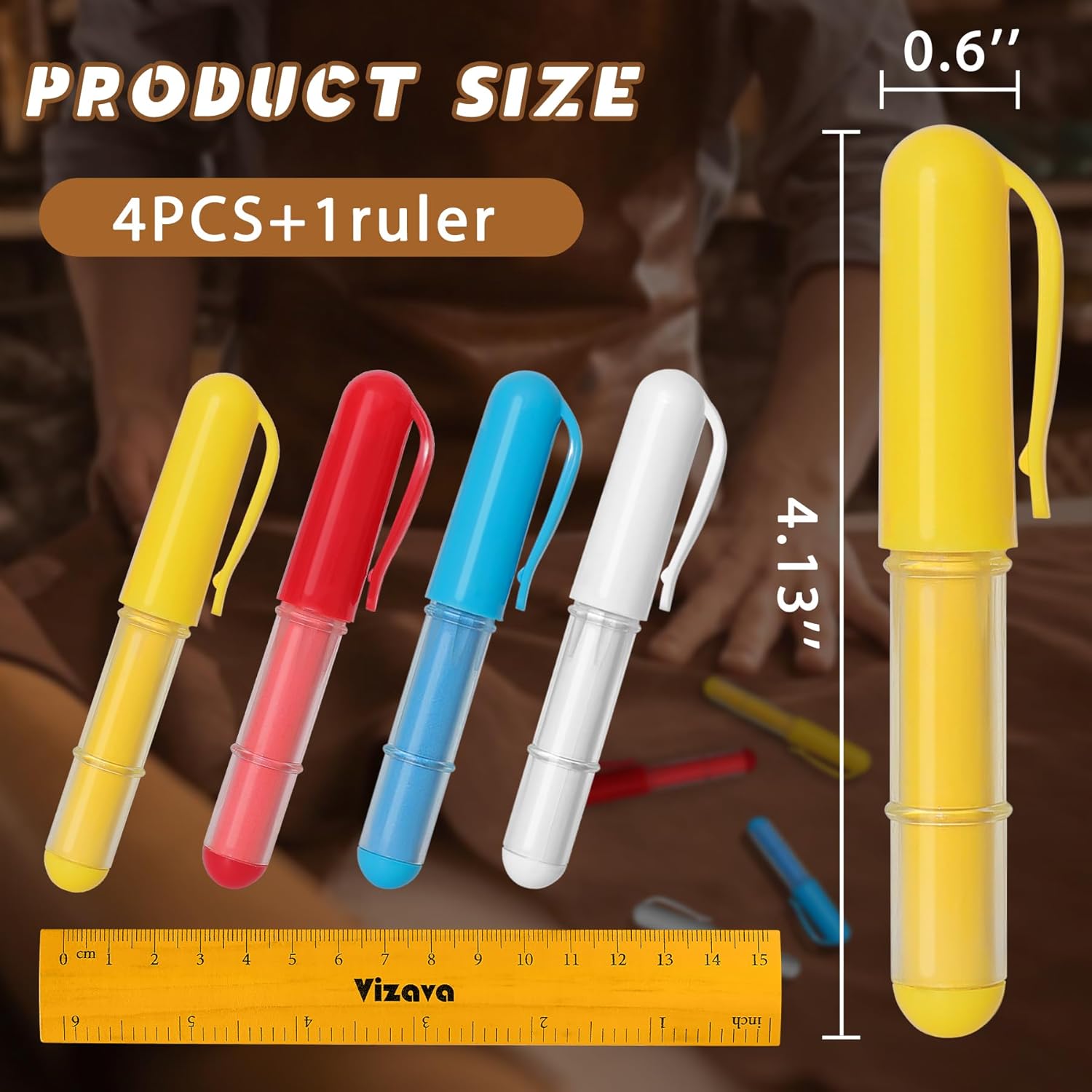 - ✅ Precision Marking: Vizava fabric chalk marker pens set includes 4 Colors fabric markers red yellow blue and white sew chalk and one 15cm ruler .Chalk roller create lines clear visibility on dark or light fabrics and flawless markings on fabrics for sewing, quilting, and crafting.Perfect for drawing intricate patterns and precise lines.