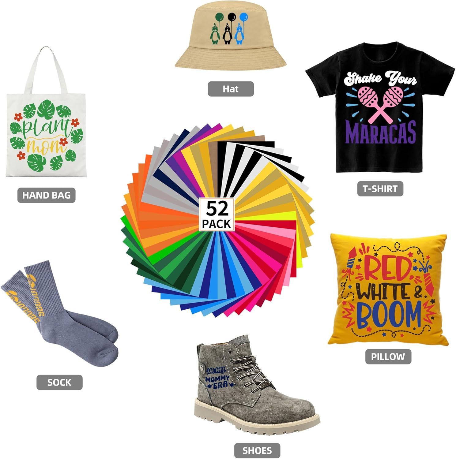 guangyintong HTV Heat Transfer Vinyl Bundle, 52 Pack 12" x 10" Iron on Vinyl for T-Shirt, 33 Assorted Colors Clossy Reflective and Fluorescent HTV Vinyl for All Cutting Machine Easy to Cut & Weed