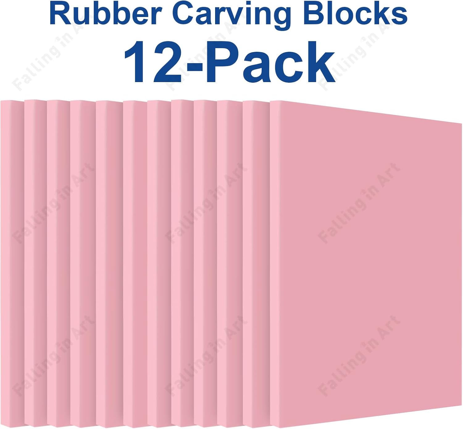 Falling in Art 4 x 6" Pink Rubber Carving Blocks, 12 Pack Soft Linoleum Blocks for Printmaking, Stamp Making, and DIY Crafting, 4/17" Thick