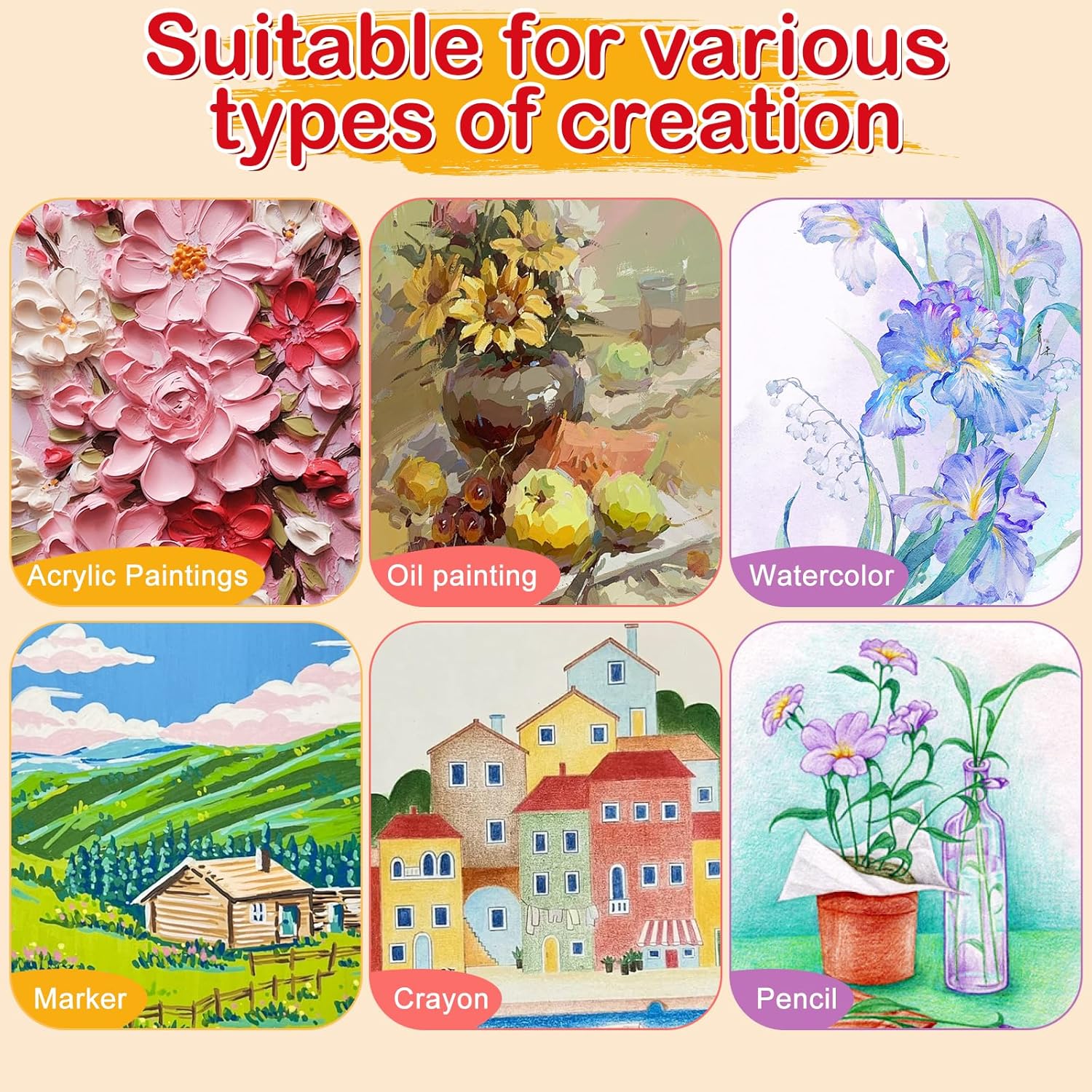 - 【Widely Used】Watercolor canvases for painting suitable for oil painting,watercolors,acrylic paintings,tempera paintings,pouring,Gouache and Tempera,etc.. Canvas bulk are also suitable for various occasions such as teaching, gatherings, home decorations, birthday decorations, etc.