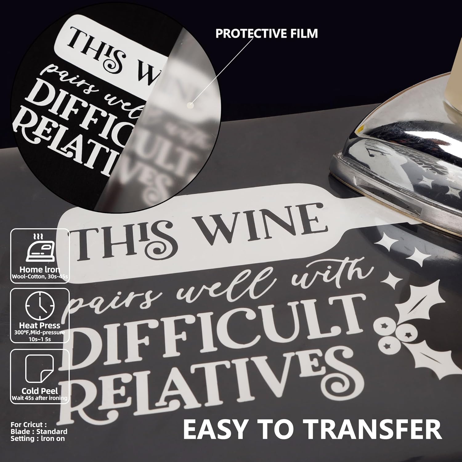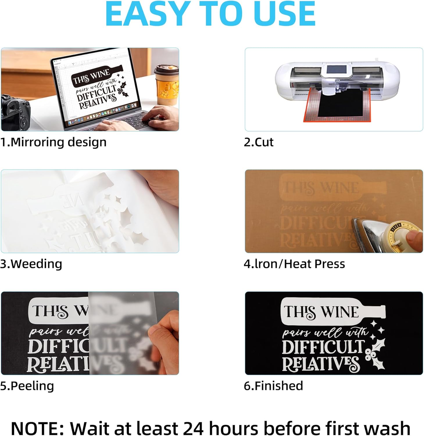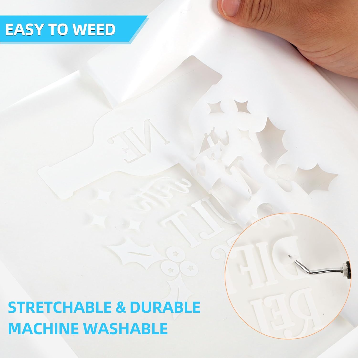 - UNIQUE ADHESIVE BACKING: Our white iron on vinyl has two layers, a colored membrane and a protective sticky plastic membrane. You can stick back when you weed wrongly, the misaligned part can be glued back without wasting material. The sticky transparent plastic film can be fixed on the clothes, which don't move easily. So it is suitable for beginners, easy to weed and heat