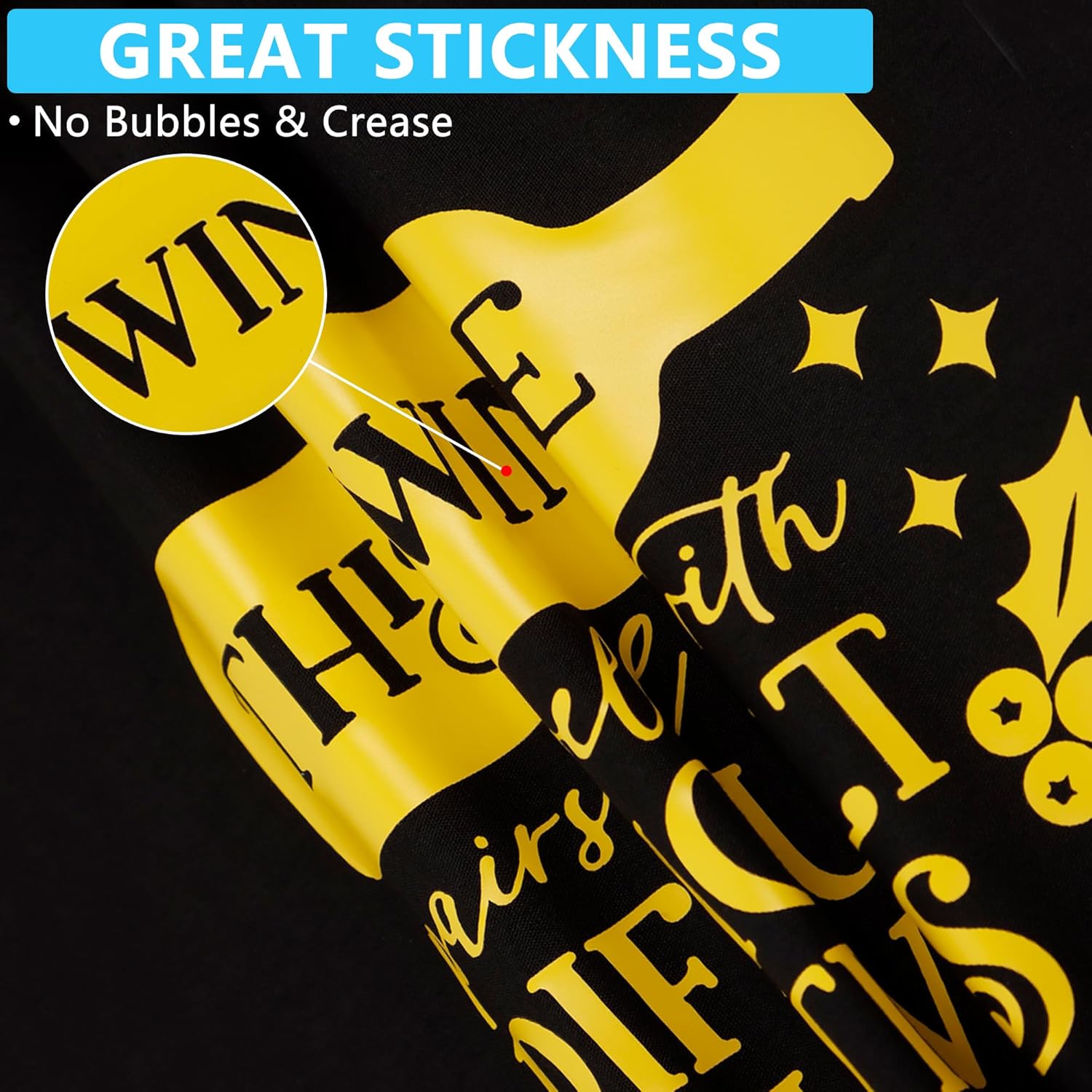 - UNIQUE ADHESIVE BACKING: Our yellow iron on vinyl has two layers, a colored membrane and a protective sticky plastic membrane. You can stick back when you weed wrongly, the misaligned part can be glued back without wasting material. The sticky transparent plastic film can be fixed on the clothes, which don't move easily. So it is suitable for beginners, easy to weed and heat