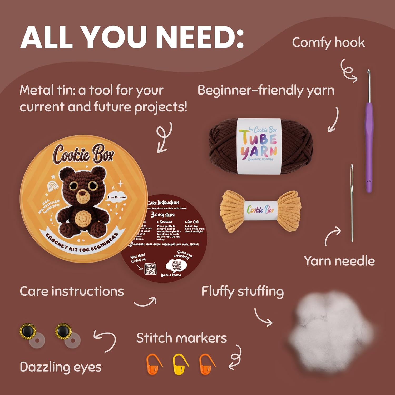 Cookie Box Crochet Kit for Beginners β Gift Set to Make Bear Bruno Amigurumi Plushie β Easy DIY Crochet & Knitting Starter Kit with Video and PDF Tutorials