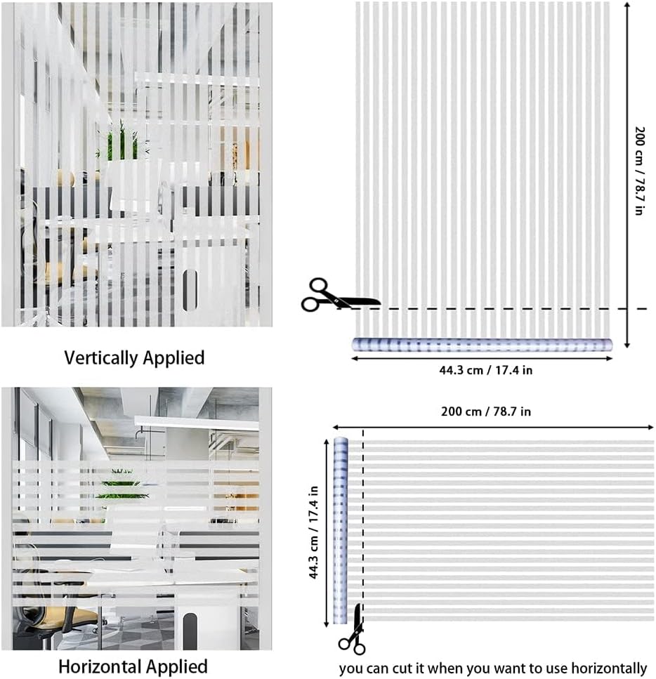 - Stylish Striped Design: The fully frosted striped pattern gives this privacy window film a sleek, built-in blinds look, perfect for adding a modern touch to glass doors or windows. The stripes can run vertically or horizontally to suit your dรฉcor.