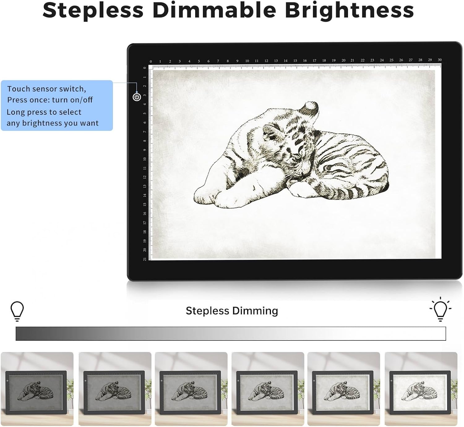 - <๐ฆ๐๐ฒ๐ฝ๐น๐ฒ๐๐ ๐๐ถ๐บ๐บ๐ฎ๐ฏ๐น๐ฒ>: The diamond art light board features stepless dimming capability, allowing users to adjust the brightness to any desired level smoothly and seamlessly. You can adjust brightness by long-pressing the button and easily control the brightness according to your preference or ambient lighting conditions. With stepless dimming,you can even achieve optimal visibility and clarity, enhancing their overall experience and productivity when using the light pad for various tasks such as drawing, tracing, or diamond painting.
