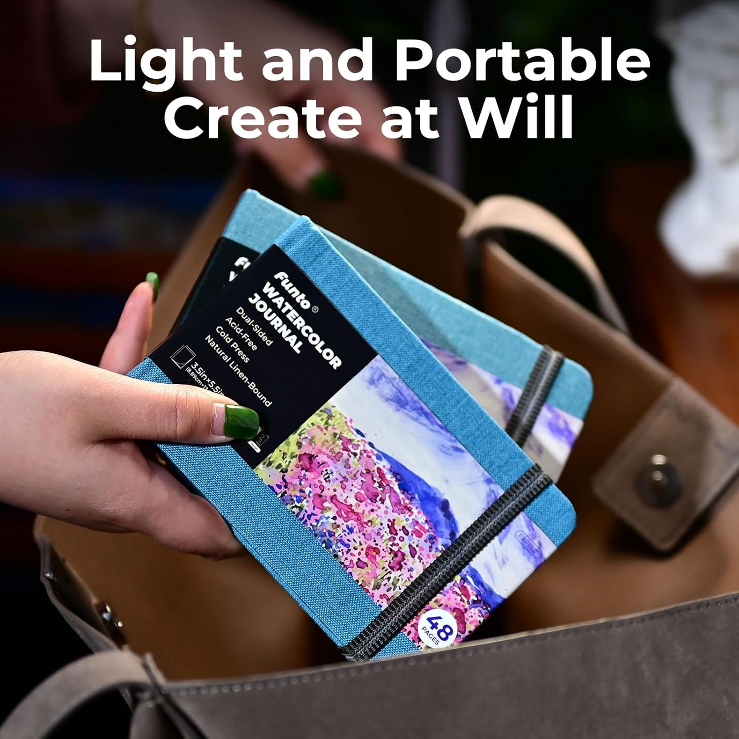 Funto Watercolor Journal, 3.5x5.5, 2 Pack, 24 Sheets Each, Blue Cloth Cover, 110lb/230gsm, Suitable for Techniques and Mixed Media