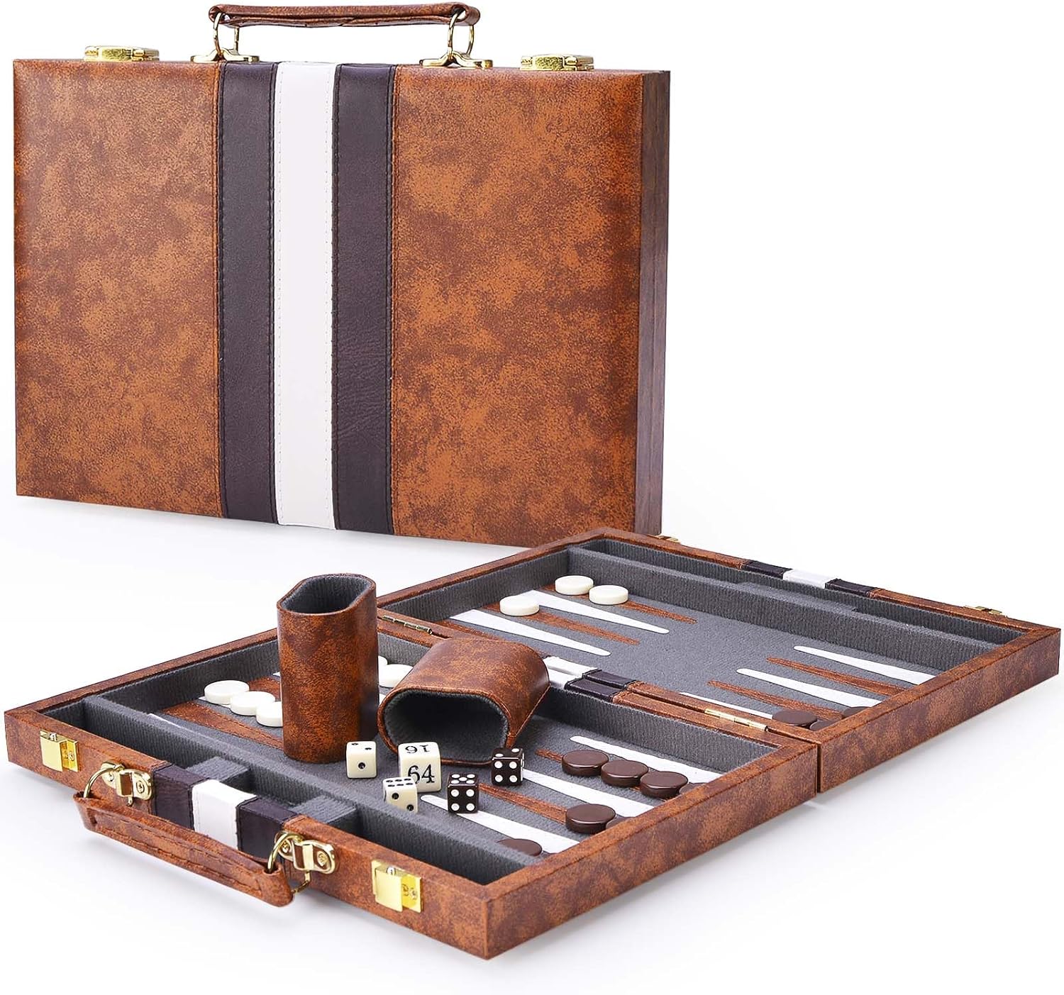 AMEROUS Backgammon Set, 11 Inches Classic Board Game withLeather Case, Folding Board, Gift Package, Portable Travel Strategy Backgammon Game Set for Adults, Kids (Small, Brown)