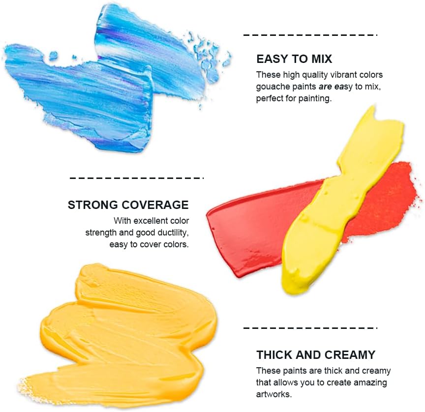 - 🎨24 VIBRANT COLORS OF GOUAHCE TUBES: Upgraded design with excellent sealing lid will keep our gouache paint wet and creamy for getting better painting experience.