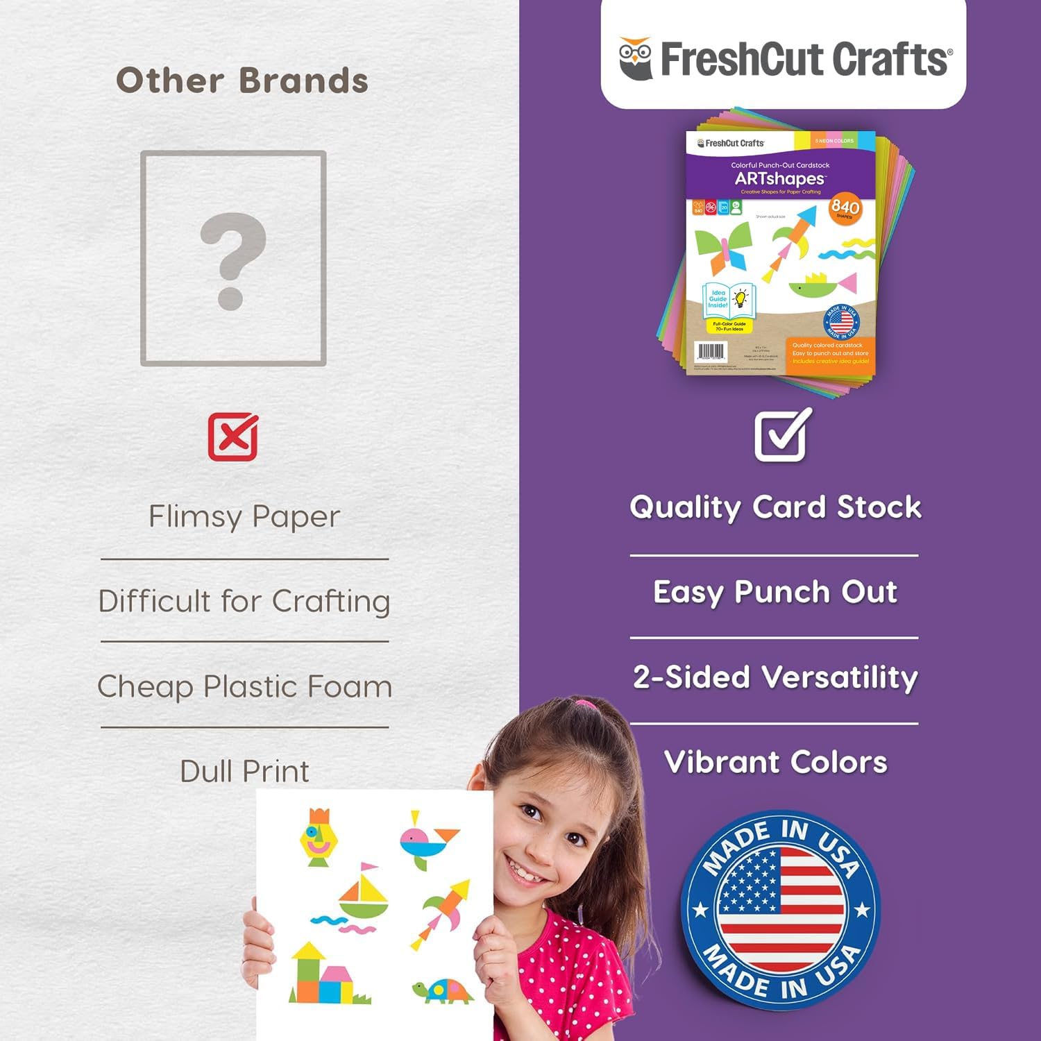 - FEEL-GOOD CRAFTING: At FreshCut Crafts, we're all about crafting with a conscience. Our products are not only about creativity but also about making a positive impact. Proudly family-made in the USA, we use high-quality, acid-free American-made paper that's perfect for preserving memories and creating lasting keepsakes. Our energy-efficient production processes are designed to minimize waste, ensuring that we leave a smaller footprint on the planet.