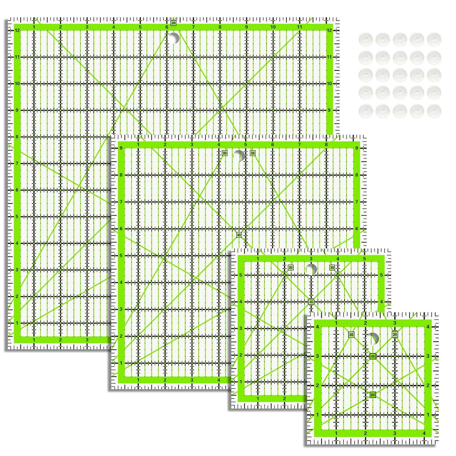 - This quilting ruler set includes 4 square rulers,50 Pieces Non-slip Rings, quilting patchwork ruler set can meet all your patchwork needs, non-slip grip rings to prevent sliding as you cut.