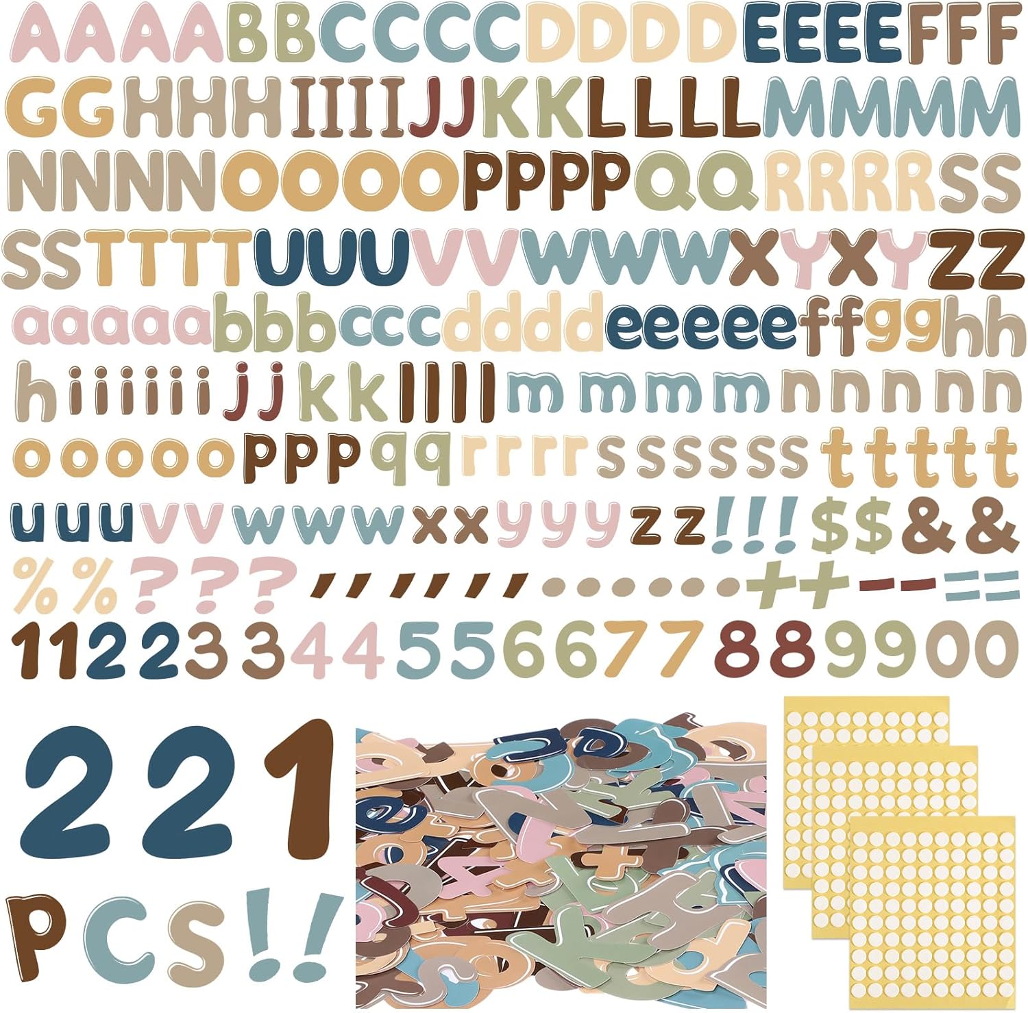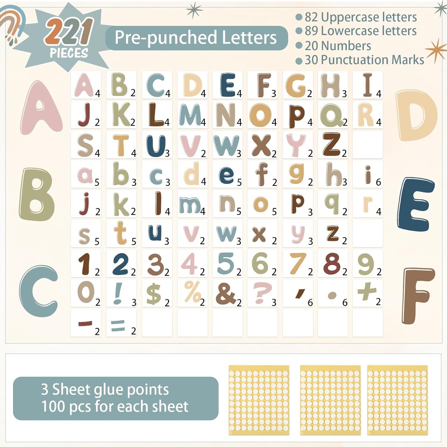 - Value Pack: this 221 pieces alphabet combo cutouts set includes 82 pieces of capital and 89 pieces of lowercase alphabet letters, 20 pieces of numbers, 30 pieces of punctuation marks and 100 pieces double-sided adhesive; Alphabet learning, sentence building, basic math training, punctuation using, satisfying all your basic skill training
