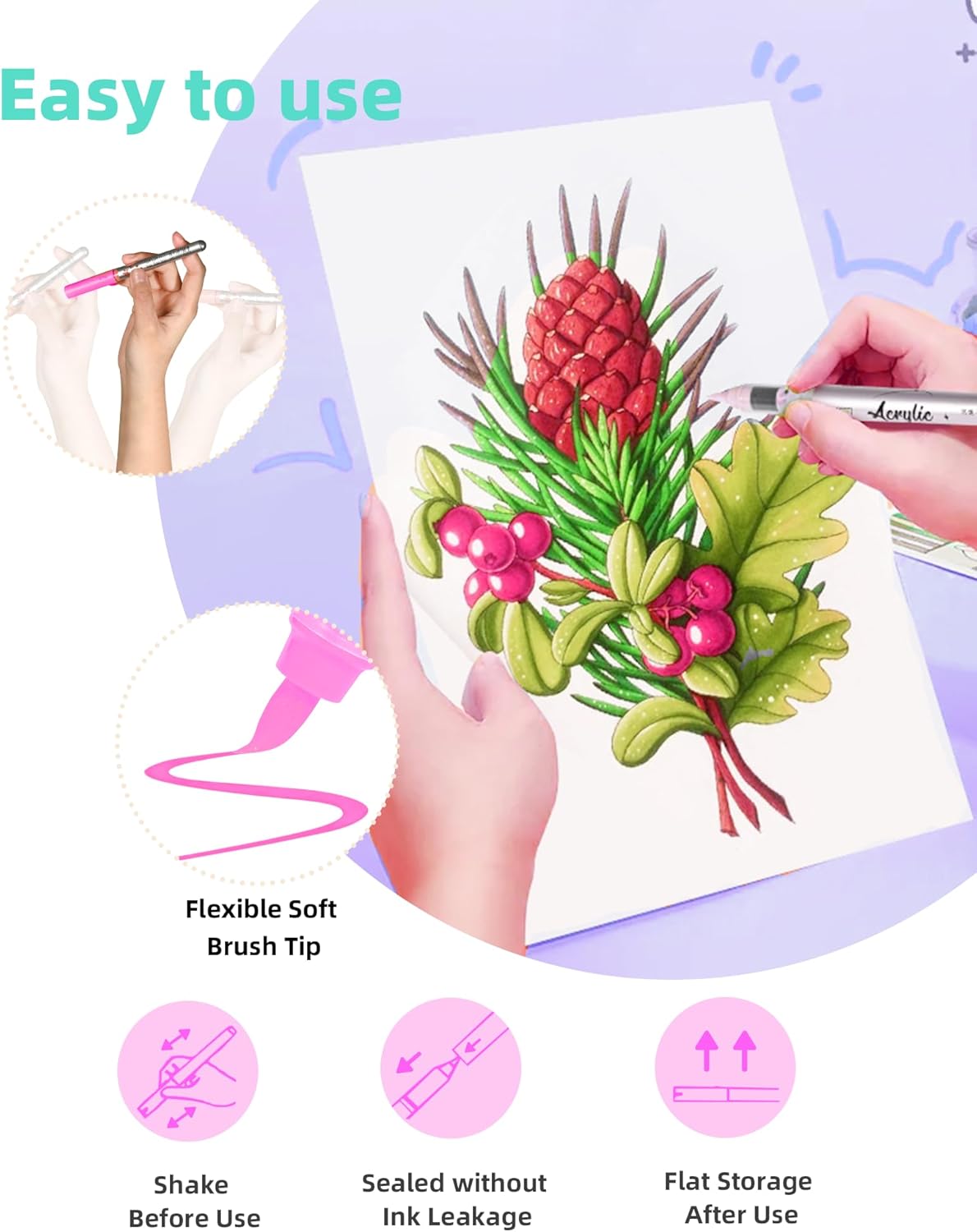 - ✅ 【Flexible Soft Tip for Limitless Creativity】The acrylic paint marker brush tip of 2~5mm writing width allows for detailed outlining or large area coloring by changing the brush pressure. The fibre brush tip is more friction-resistant than ordinary cotton nibs, has no linting, suitable for almost any surface.