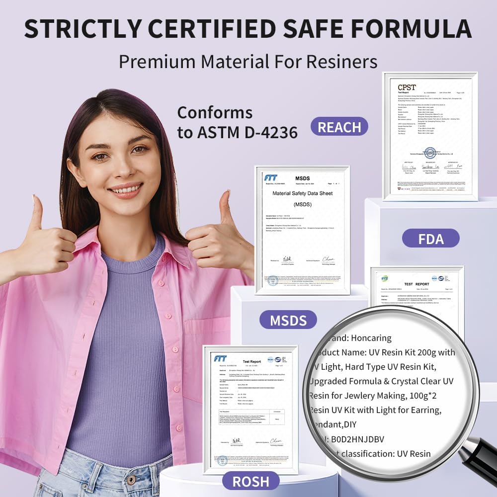 - Nice UV Resin Kit: Honcaring UV resin is made of premium materials. Silicone gluing tools can help you better operate the DIY process. Cure UV resin with UV resin light, the light power higher, the curing time shorter