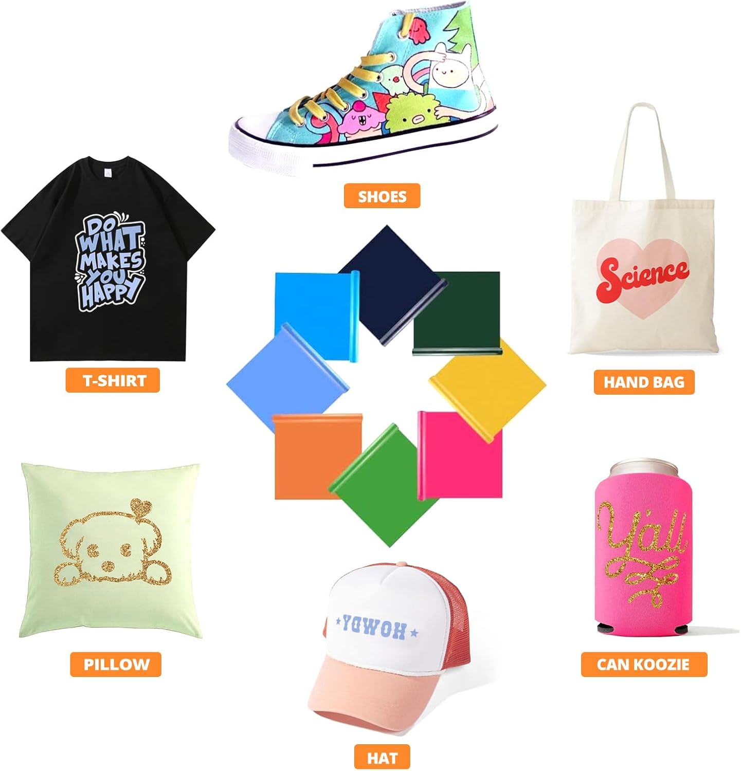 - 【USE WIDELY & SAVE TO WEAR】Your shirt, tote bags, sportswear, aprons, hat and pillow, which use our glitter htv, make you stand out from the crowd. Glitter heat transfer vinyl is suitable for athletic mesh fabrics, Cotton, polyester and cotton blend, lycra/spandex, textiles etc. Our glitter htv vinyl materials are SGS certified and are safe to wear
