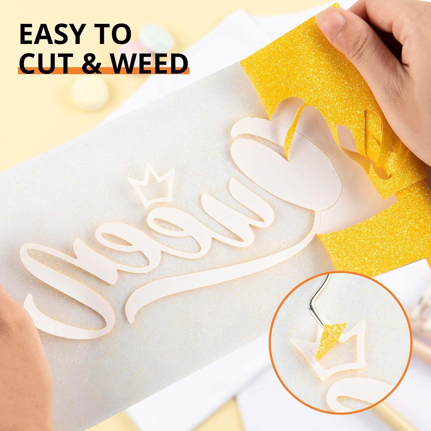 - 【EASY TO CUT WEED TRANSFER】The glitter htv is thick with an excellent cutting application characteristics, any cutters’ blade can cut it through easily. The medium tack transfer film makes weeding like a dream, the glitter heat transfer vinyl is extremely sensitive to heat and pressure makes transfer quickly, which will save your time. The glitter iron on vinyl is sensitive to temperature and pressure, which can be heat transferred on any t-shirt easily
