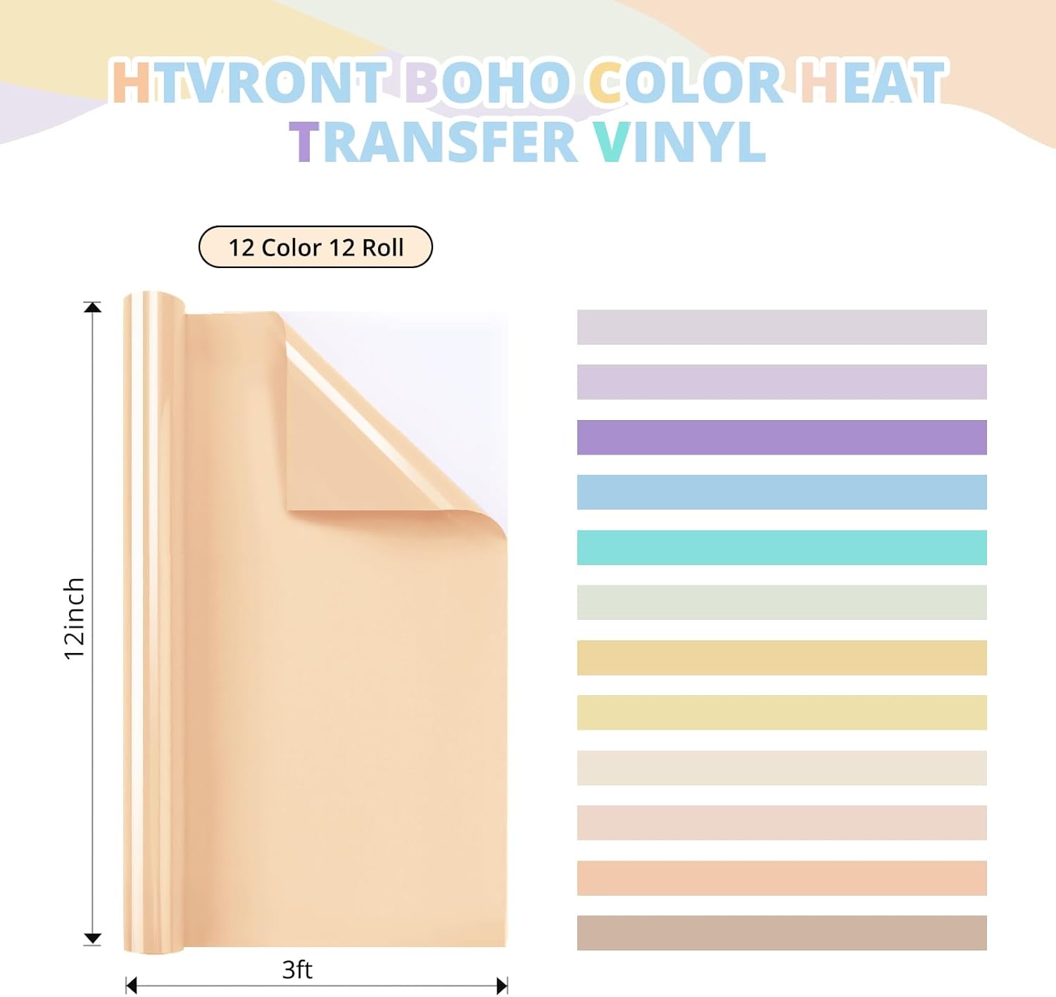 HTVRONT Boho HTV Vinyl Bundle - 12 Pack 12" × 3FT Heat Transfer Vinyl for T Shirts, Pastel Iron on Vinyl Compatible with Cricut Cutting Machine, Easy to Use HTV with 12 Macarons Color