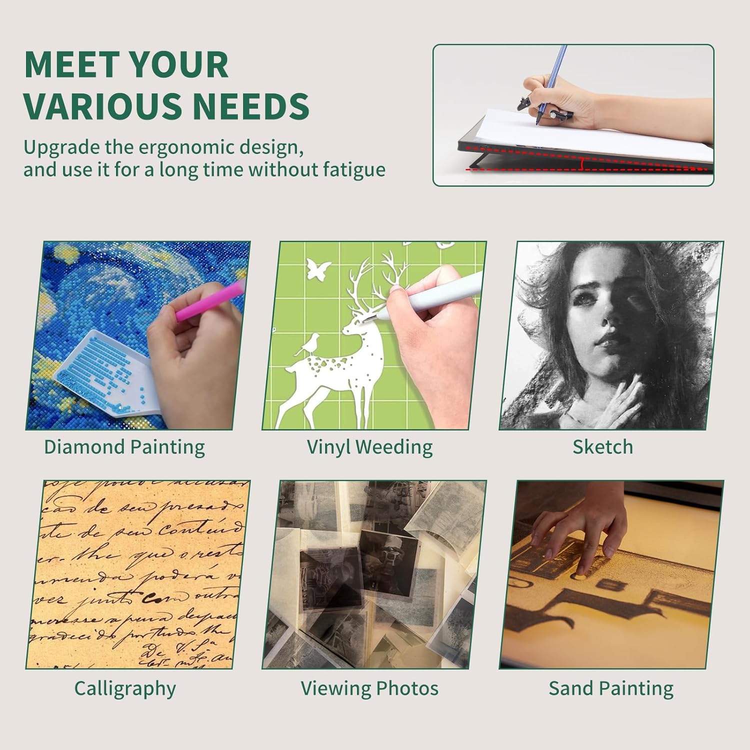 - <๐๐๐ฒ ๐ฃ๐ฟ๐ผ๐๐ฒ๐ฐ๐๐ถ๐ผ๐ป ๐๐ฒ๐๐ถ๐ด๐ป>: This LED light box ensures eye protection with flicker-free LED light, providing uniform and gentle illumination. It offers three color temperature options (White, Warm Yellow, Warm White) to mimic natural daylight or indoor lighting, catering to users' preferences. Moreover, our light tracing box utilizes advanced technology to eliminate flickering, ensuring consistent illumination without hotspots, thus reducing eye strain caused by uneven lighting.