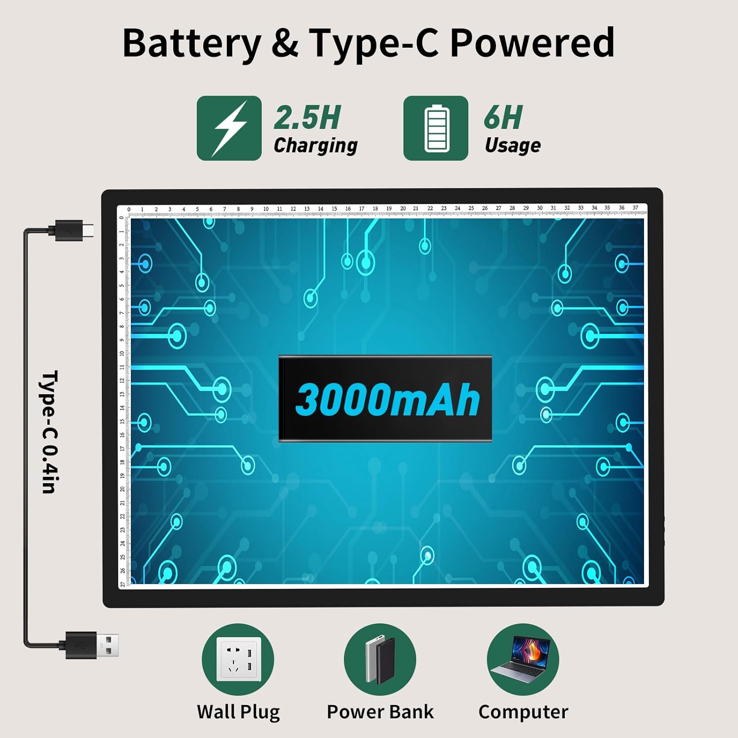 - <๐๐ฎ๐๐๐ฒ๐ฟ๐ ๐ฃ๐ผ๐๐ฒ๐ฟ๐ฒ๐ฑ ๐๐ฒ๐๐ถ๐ด๐ป>: The cordless light drawing pad boasts a rechargeable battery, delivering up to 4 hours of uninterrupted usage with just a single 2.5-hour charge. This functionality elevates the light pad's mobility, empowering users to engage in work or creativity even in settings devoid of power sources. Its portability renders it perfect for outdoor sketching or scenarios where power outlets are scarce. The absence of cords translates to reduced clutter and heightened convenience in your workspace.