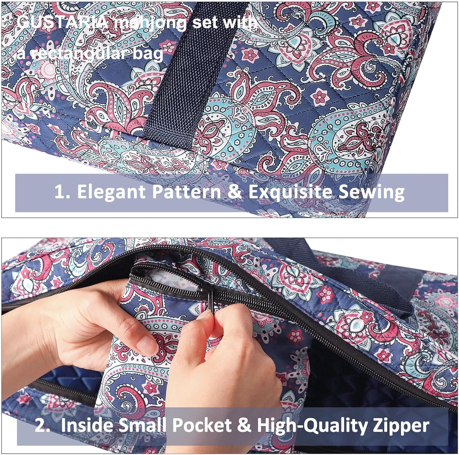 - ATTRACTIVE PRINTED CARRYING CASE: Our American mahjong game set comes with a beautiful soft bag featuring an elegant pattern with blue and red color. The lightweight and tear-resistant case is equipped with a zippered top, inner pocket, and convenient shoulder straps, making it a stylish and practical choice for easy portability. Spend quality leisure time with your family and friends with this gorgeous game set.