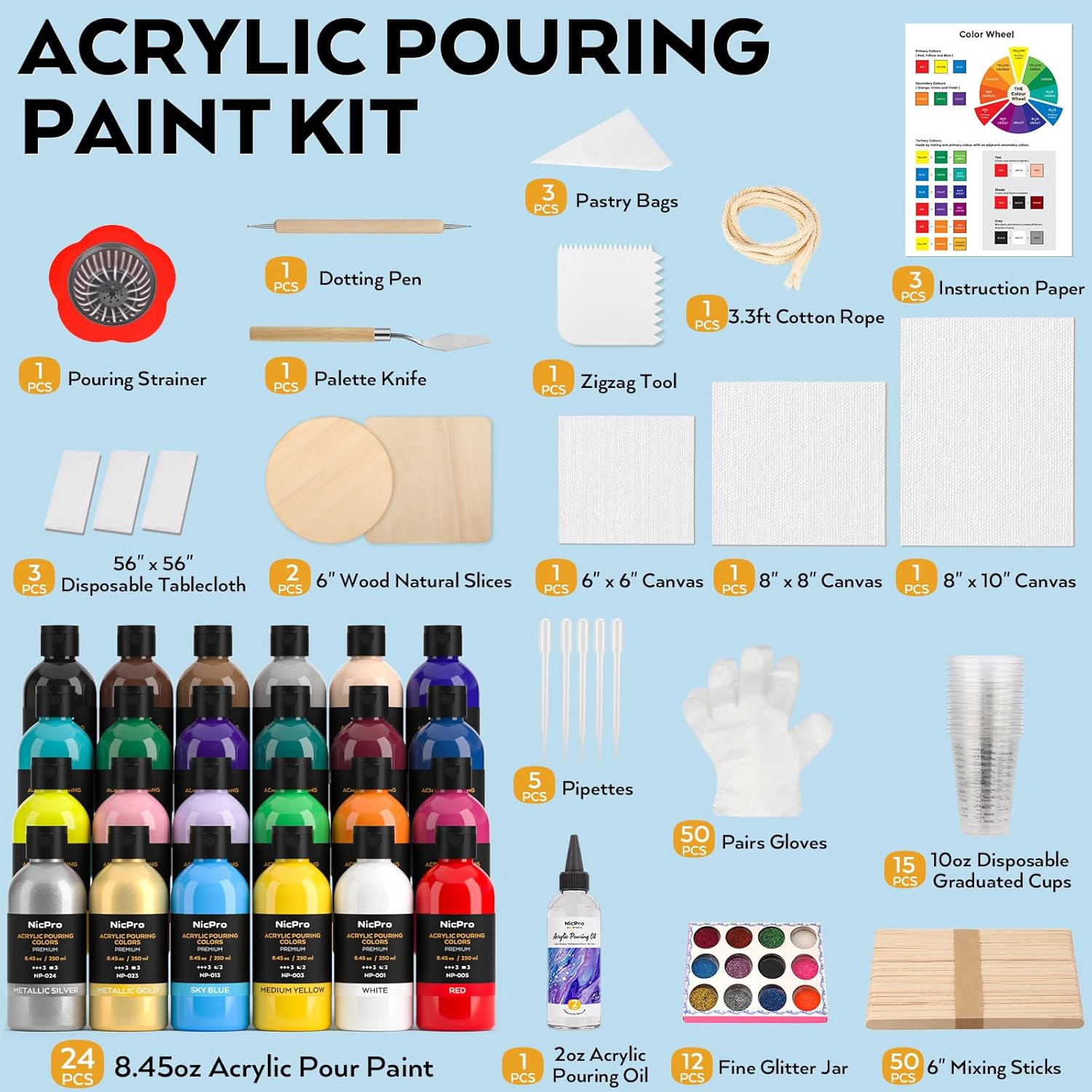 Nicpro 24 Colors 8.45oz Acrylic Pour Paint Supplies Kit, Large Volume Premixed High Flow Painting Bulk Set with Canvas, Wood Natural Slices, Pouring Oil, Tools Gloves, Strainer, Cups for Beginner DIY