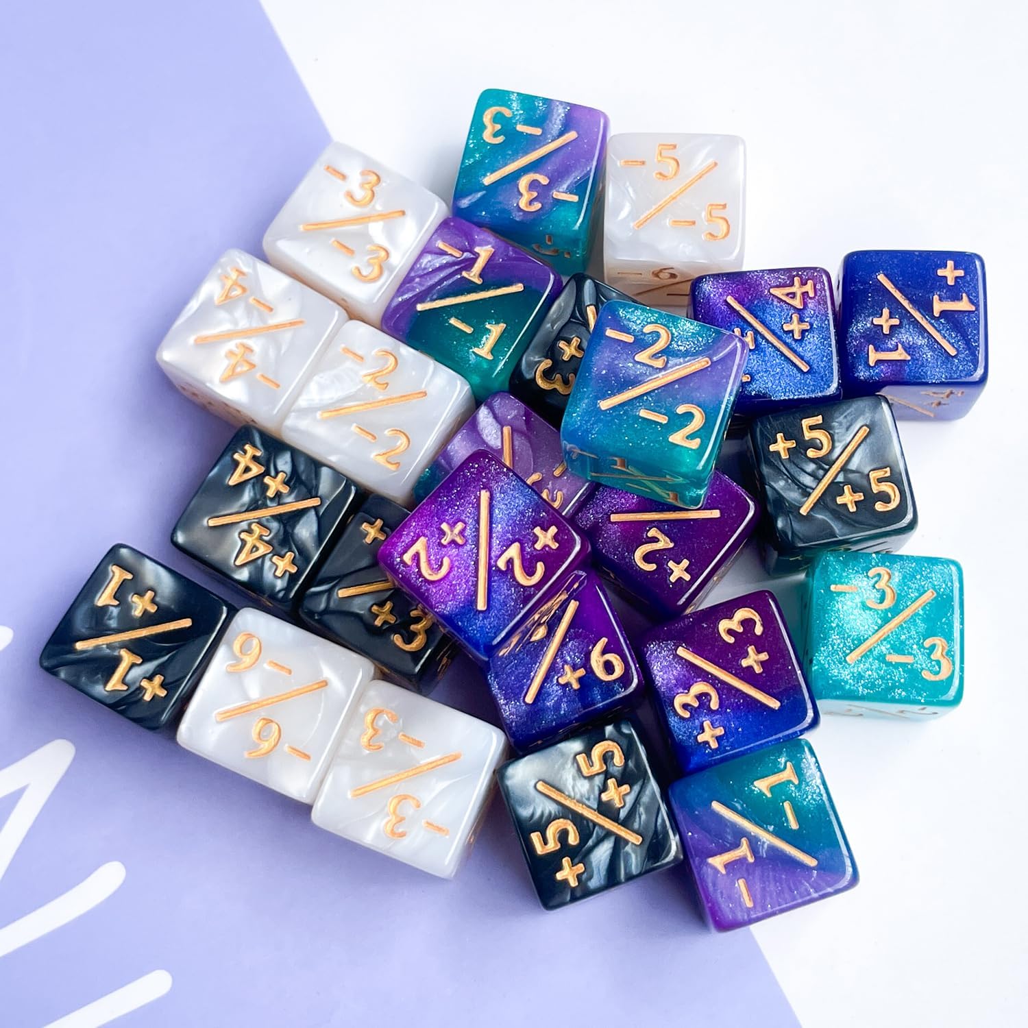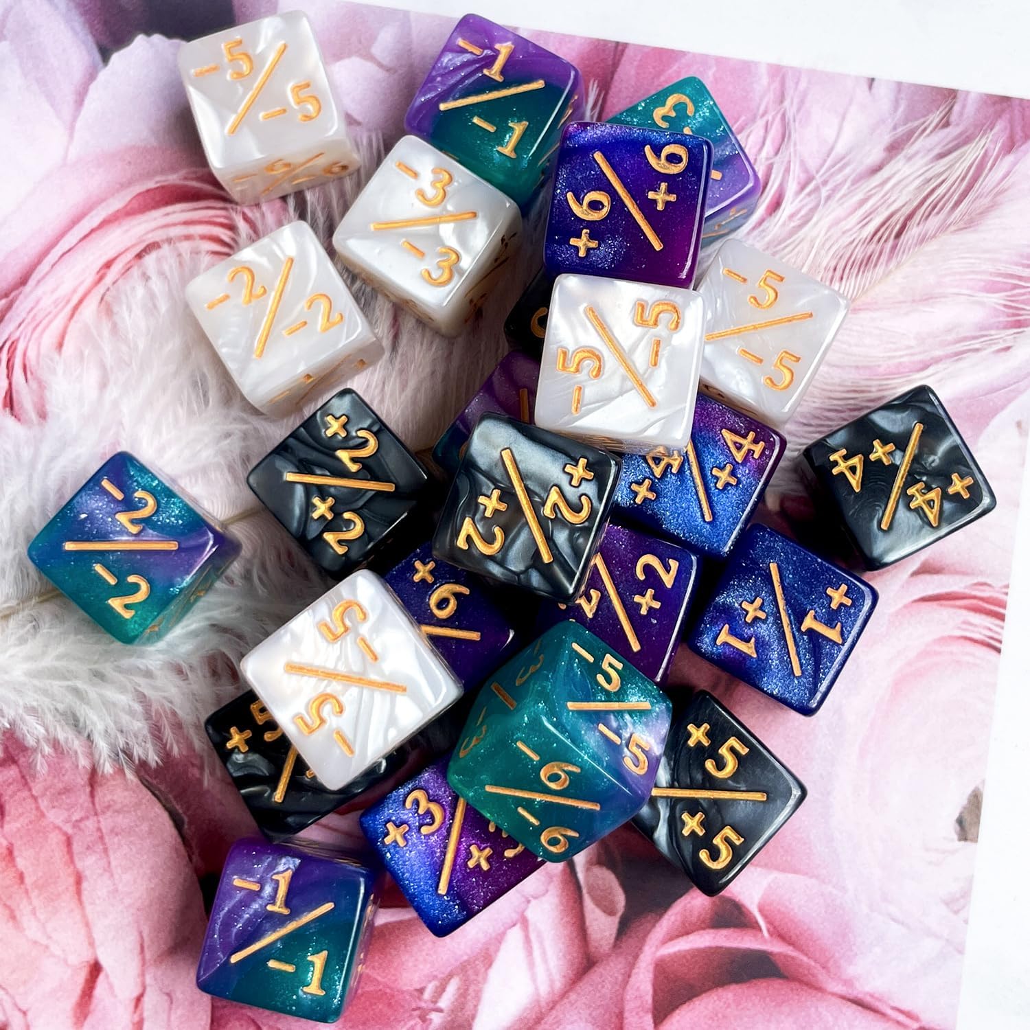 - 2、24-Dice Set Includes:12pieces-purple/black galaxy positive D6 dice, 12pieces-green galaxy/white negative D6 dice.