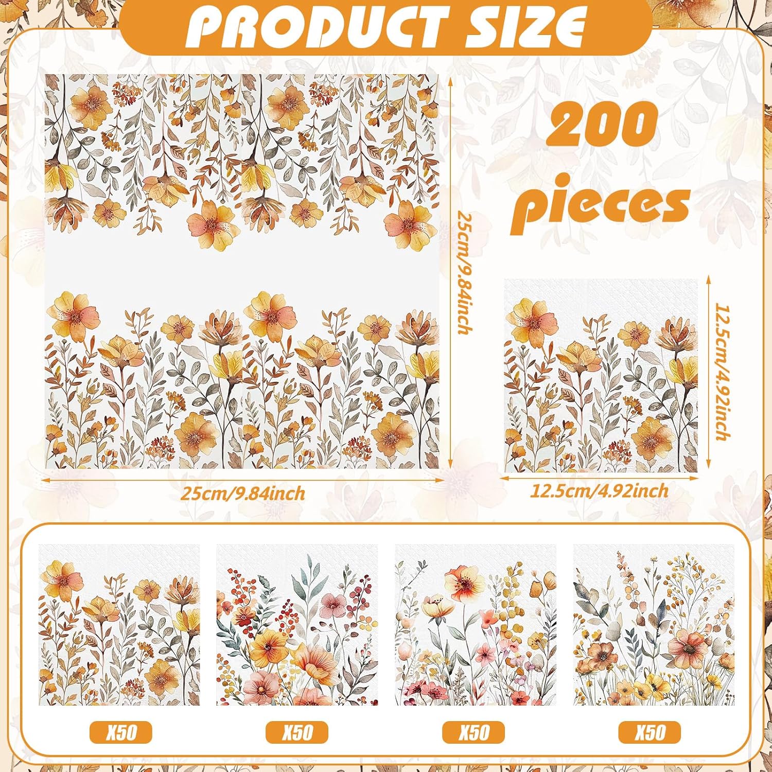 Fulmoon 200 Pieces Fall Floral Cocktail Napkins Disposable Thanksgiving Day Flower Decoupage Paper Napkins Vintage Wildflower Beverage Towel for Autumn Fall Party Favor Supplies