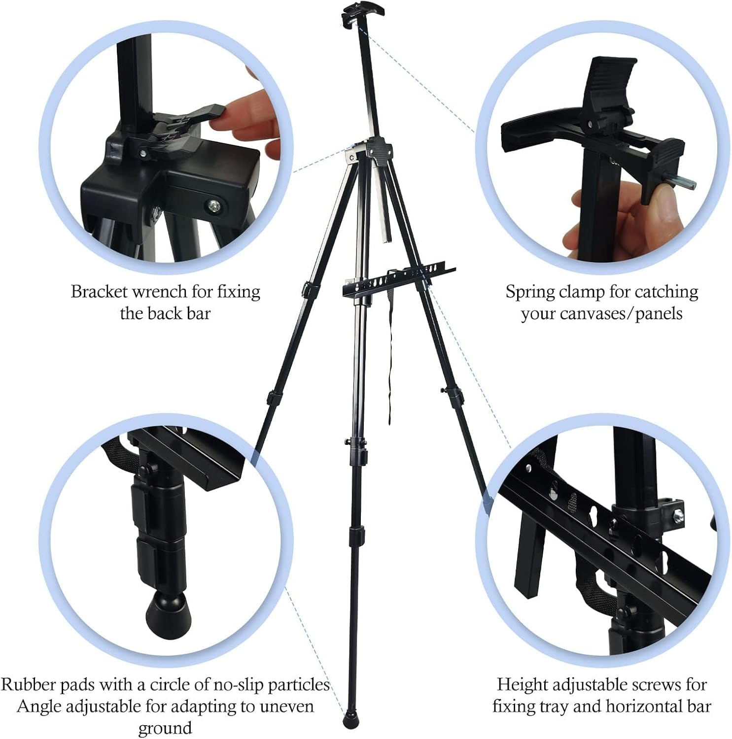 - [MATERIAL AND STABILIZING PERFORMANCE] The easel stand is made of sturdy and durable metal easel stand - lighter and more durable than other materials; the spring clip on the top of the desktop easel makes the canvas not easy to fall off and makes the easel more stable