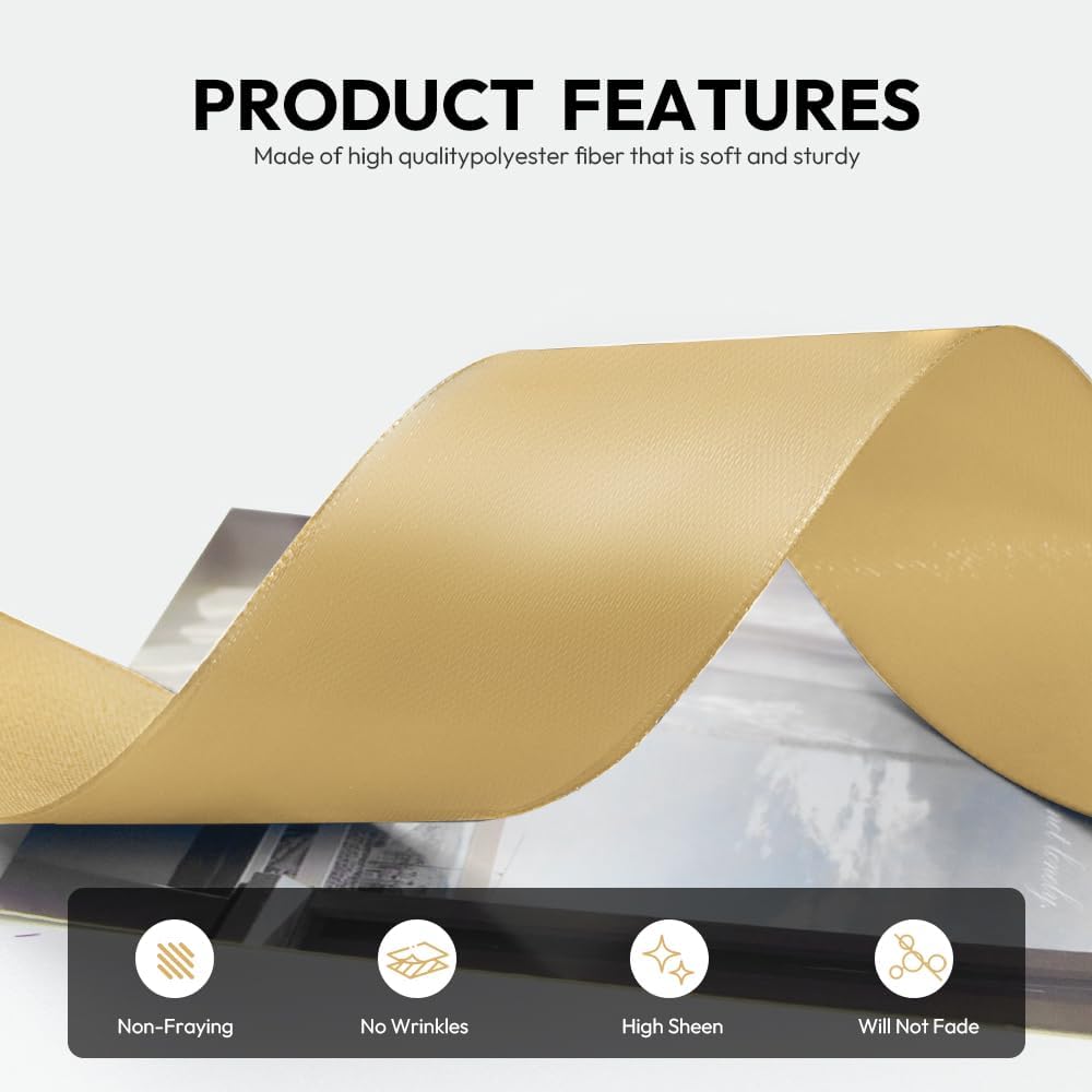 - 【High Quality】: Our fabric satin ribbon is made of 100% high-quality polyester. The single face ribbon for gift wrapping is Light Gold color and has smooth texture which is easy to cut and use.