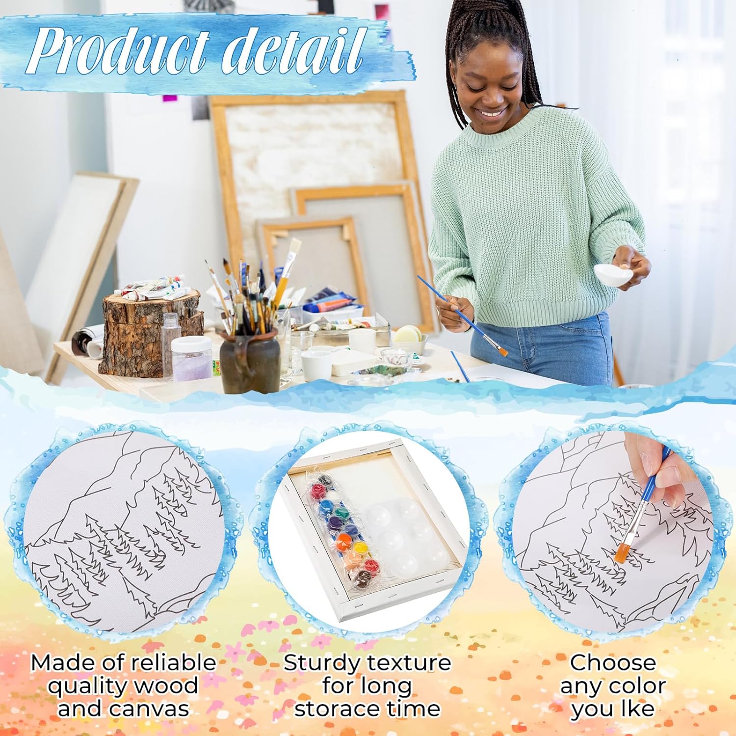 - Value Package: pre printed canvas for painting package includes 12 pre painted canvases, 12 paints in12 colors, 12 flat pen, 12 pointed pen, 12 palettes in 6 colors, 12 wooden easels; Whether you have an art party or just want to relax and paint, canvas with pictures to paint has got you covered; Note: The paint set is placed in the back of drawing board