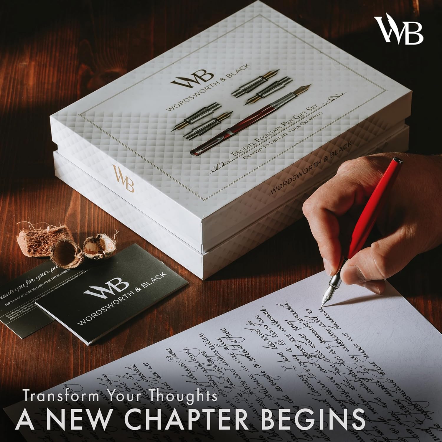 Wordsworth & Black Fountain Pen Gift Set, Includes Bottle, 6 Cartridges Refill Converter, 4 Replacement Nibs, Premium Package, Journaling, Calligraphy, Smooth Writing Pens [Red Chrome]