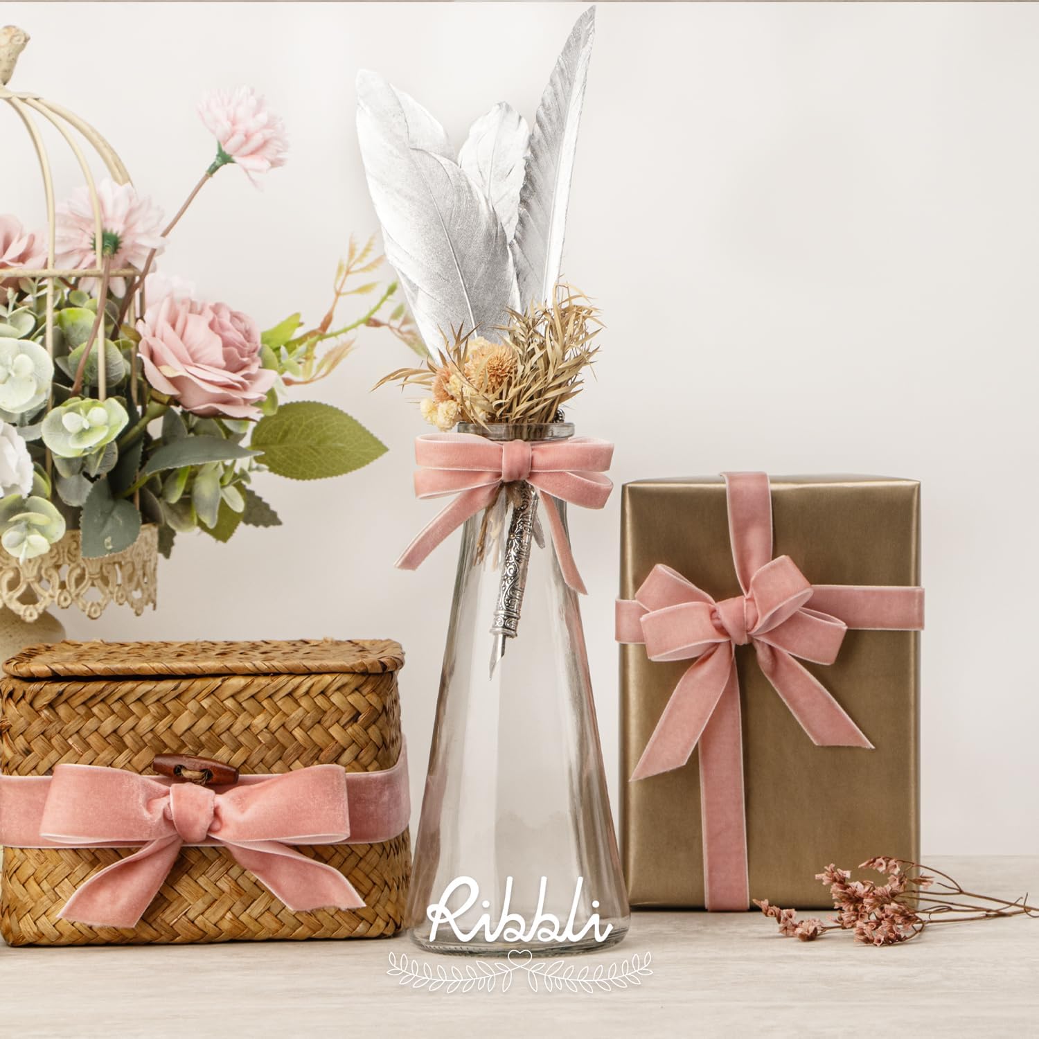 Ribbli Rose Gold Velvet Ribbon 5/8 Inches Continuous10 Yard Spool Dusty Pink Christmas Ribbon for Gift Wrapping Crafts Home Decor